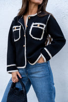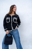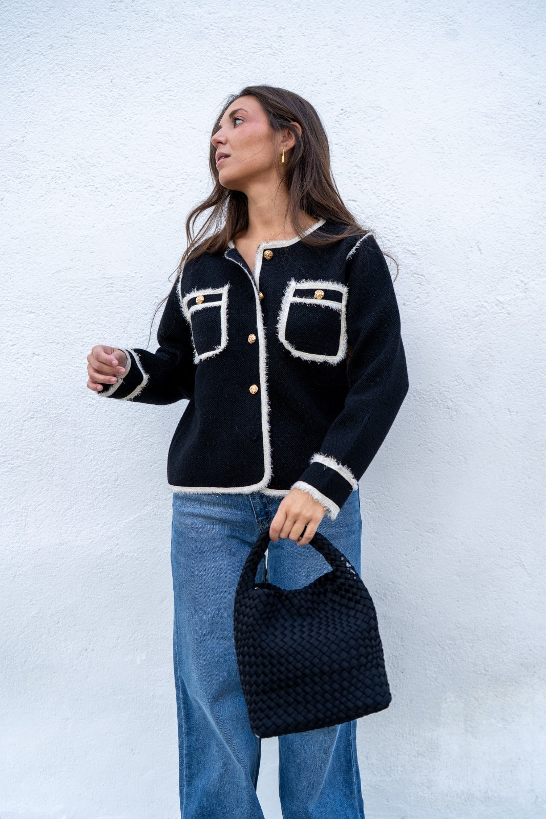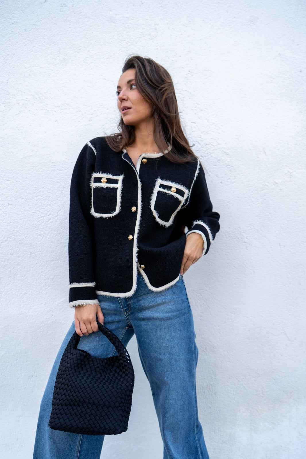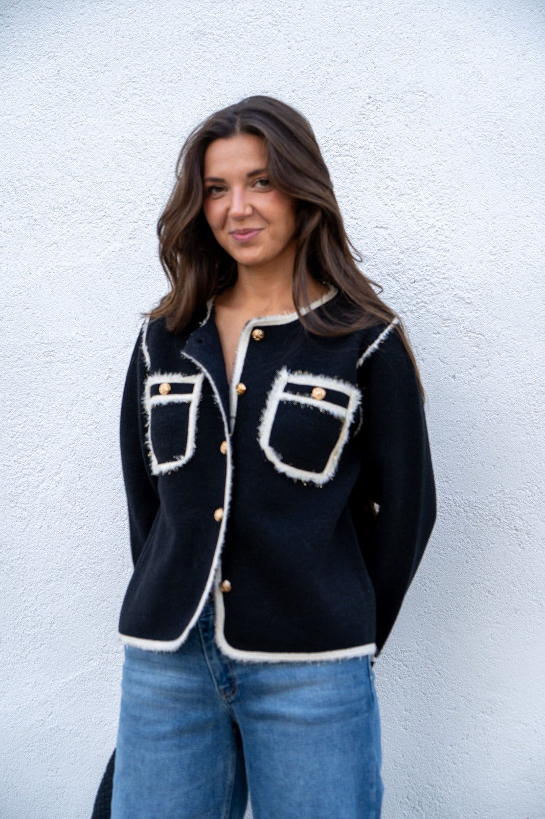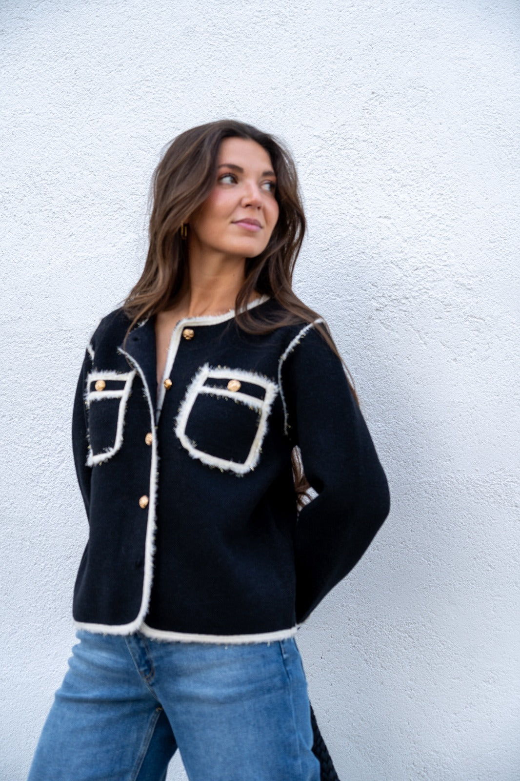 Short jacket, round neckline, long sleeves, buttoned, front pockets. In black with beige details and gold lurex.