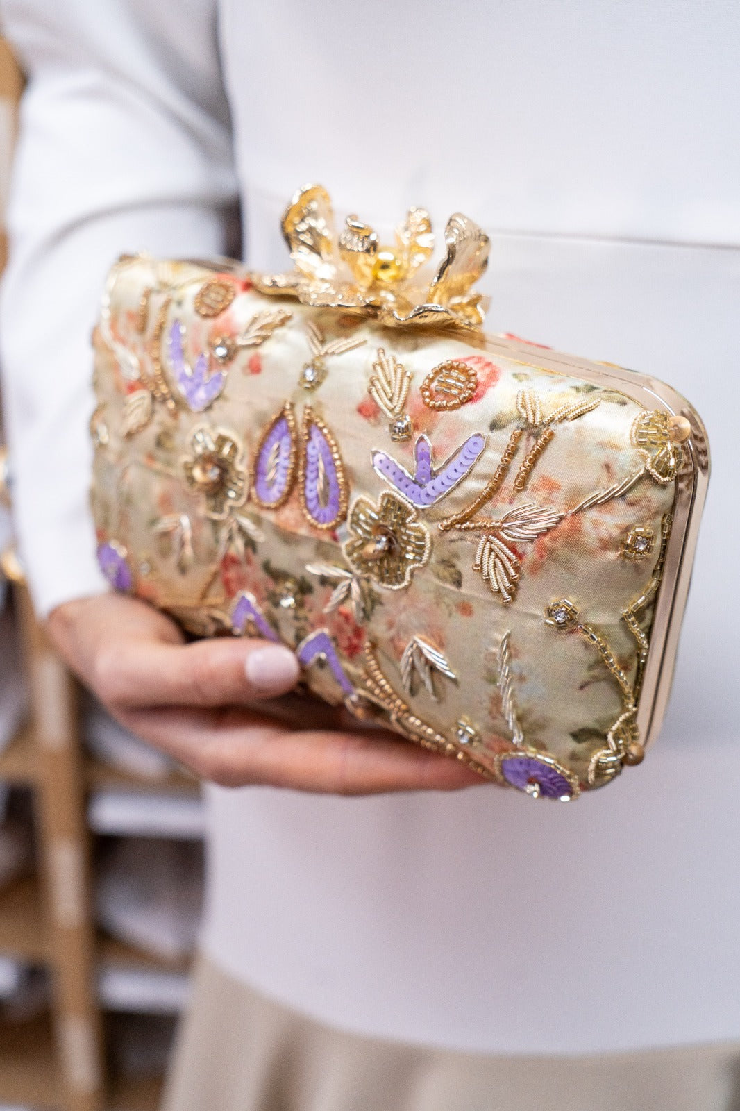 Oval handbag with a gold knob and a long chain strap. Features a palm tree print and rhinestones in various colors.