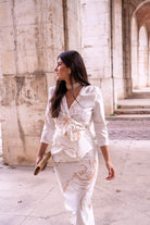 Dress with a crossover neckline, three-quarter sleeves, peplum, and a flower detail at the waist, with a back slit. In white with a print.