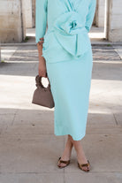 Green dress with a crossover neckline, three-quarter sleeves, peplum, and a flower detail at the waist, with a back slit.