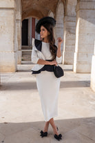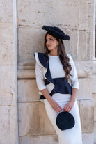 Midi dress, round neckline, three-quarter sleeves, ruffle at shoulder and waist, back slit. Two-tone black and white.