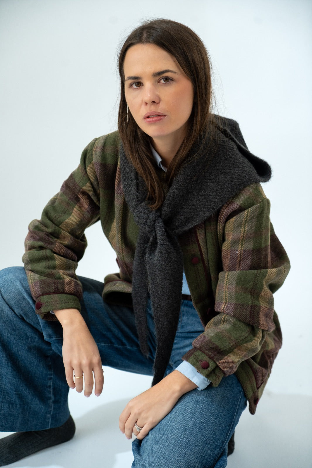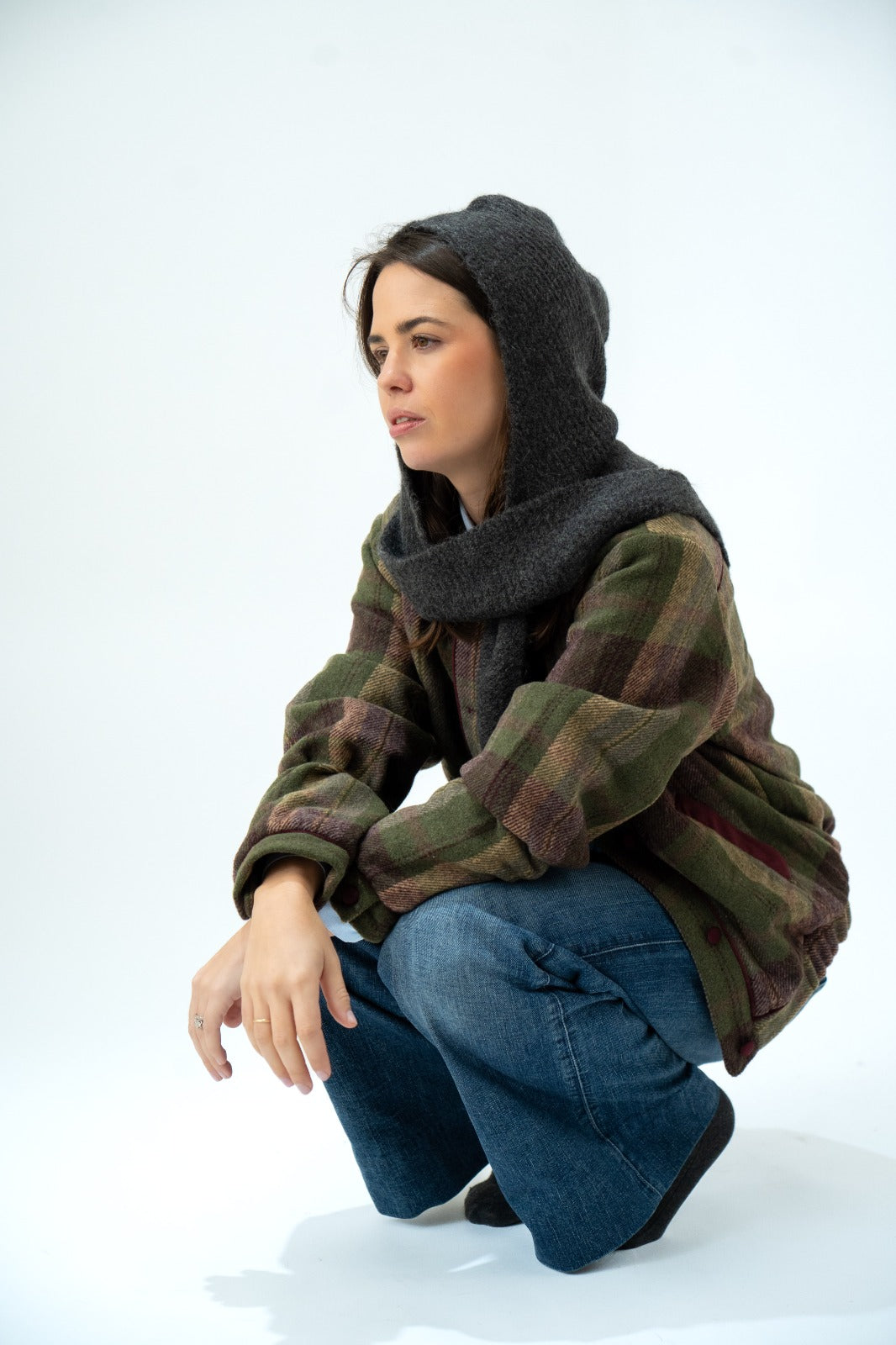 Combination of a scarf with pointed ends and a wool hood, in grey.