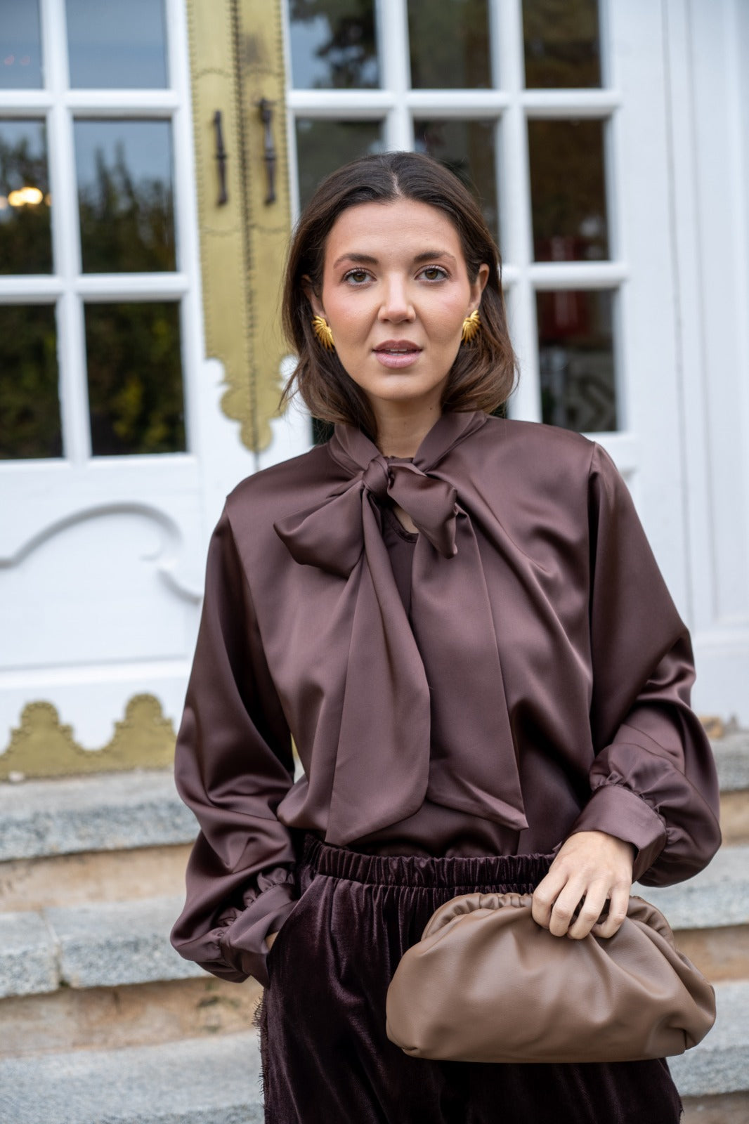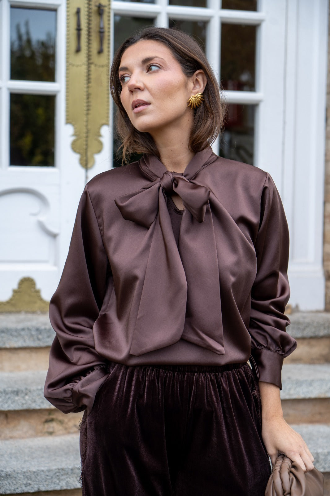 Blouse with V-neck, tie at the neck, long sleeves with cuffs, in brown satin.