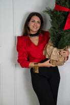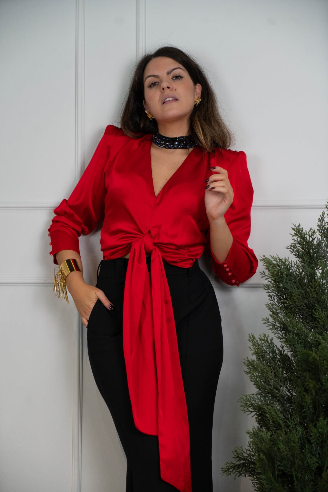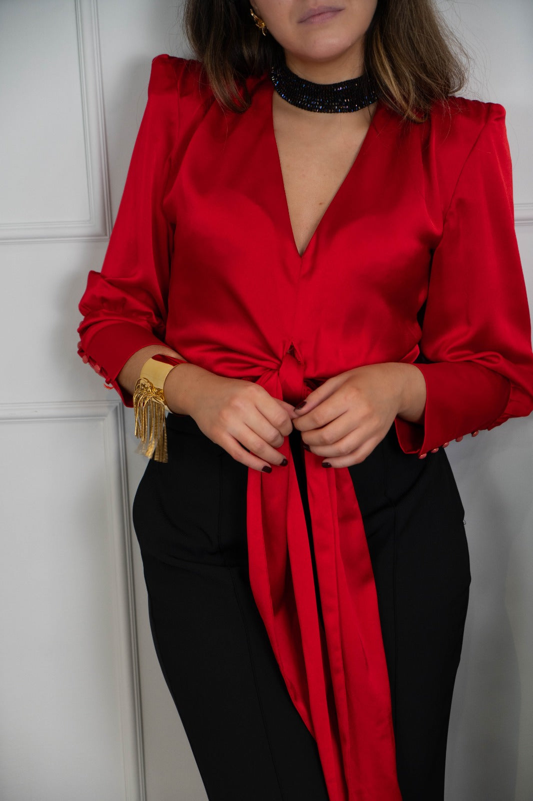 Satin blouse with a V-neckline, long sleeves with buttoned cuffs and a knotted front. Red.