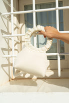 Bag with a round curly handle, lined in natural silk, in beige.