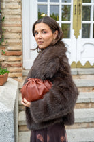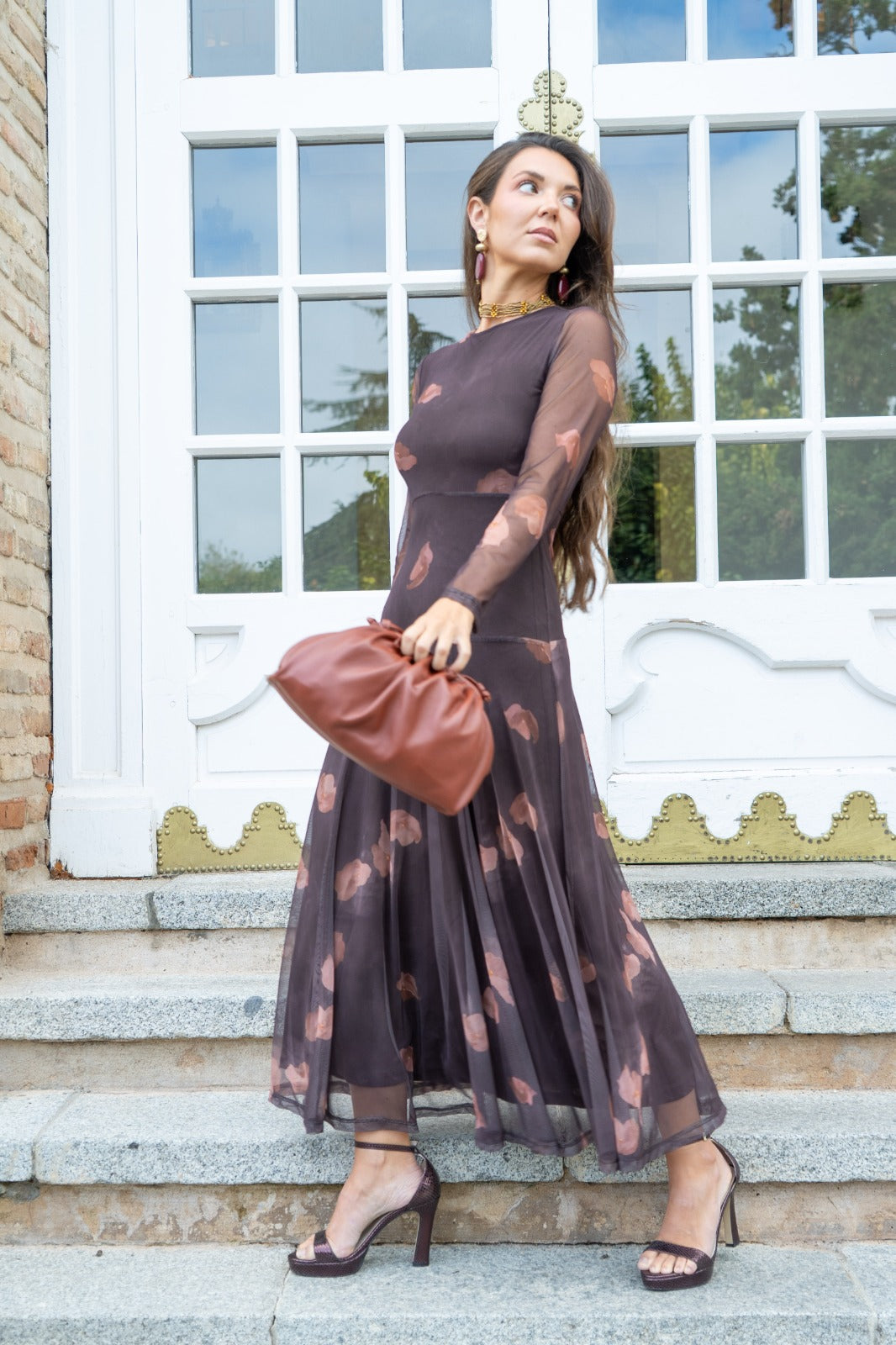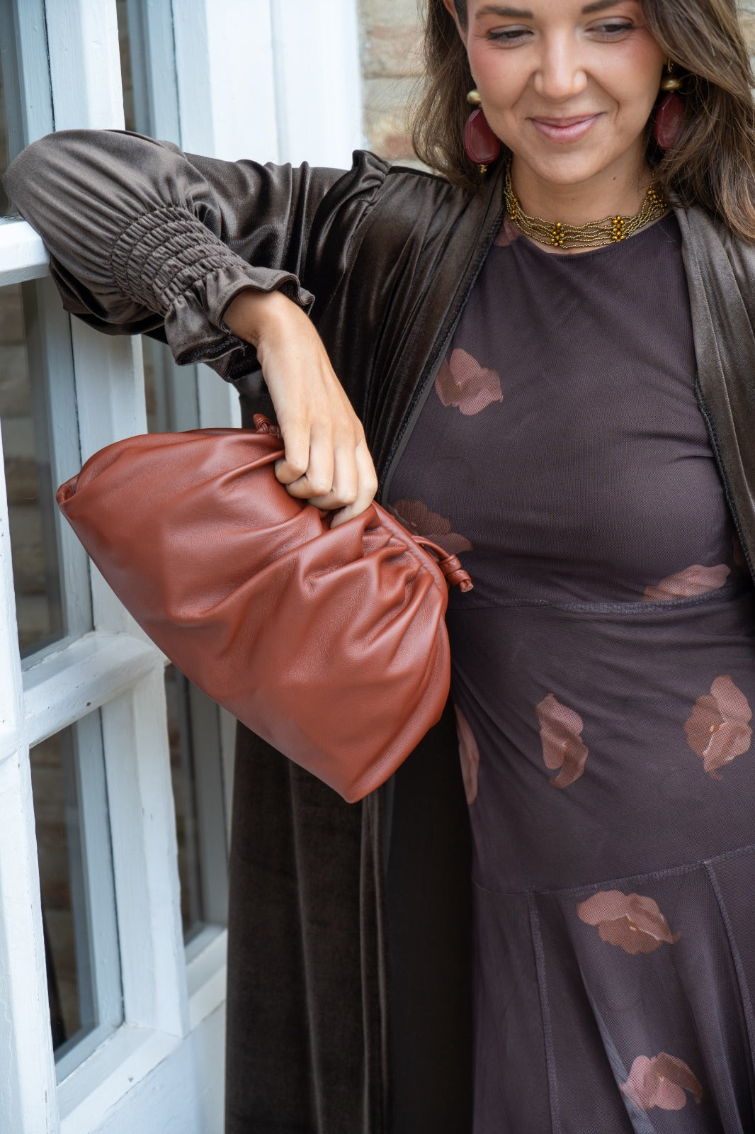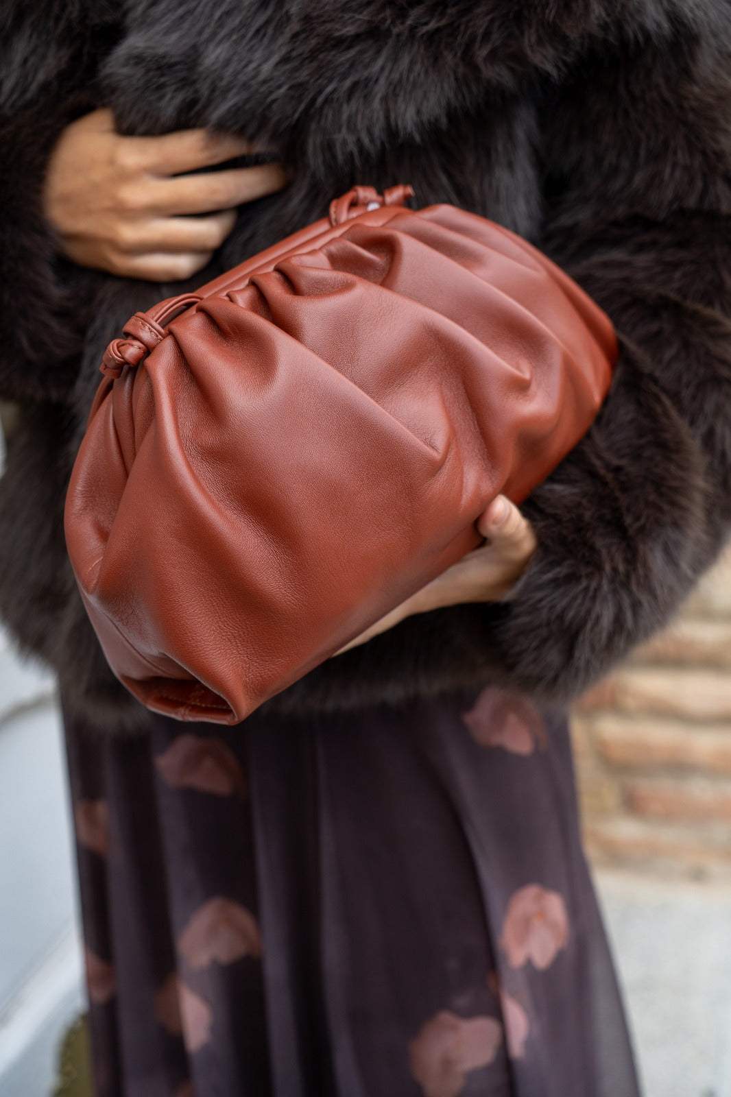 Leather bag, magnetic closure, long shoulder strap, in brown.