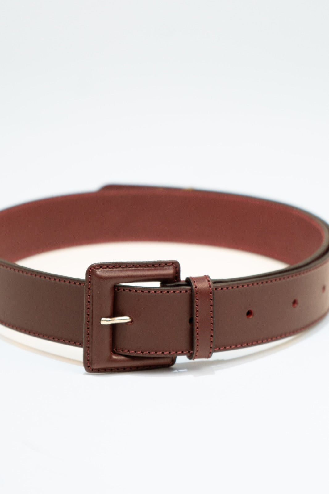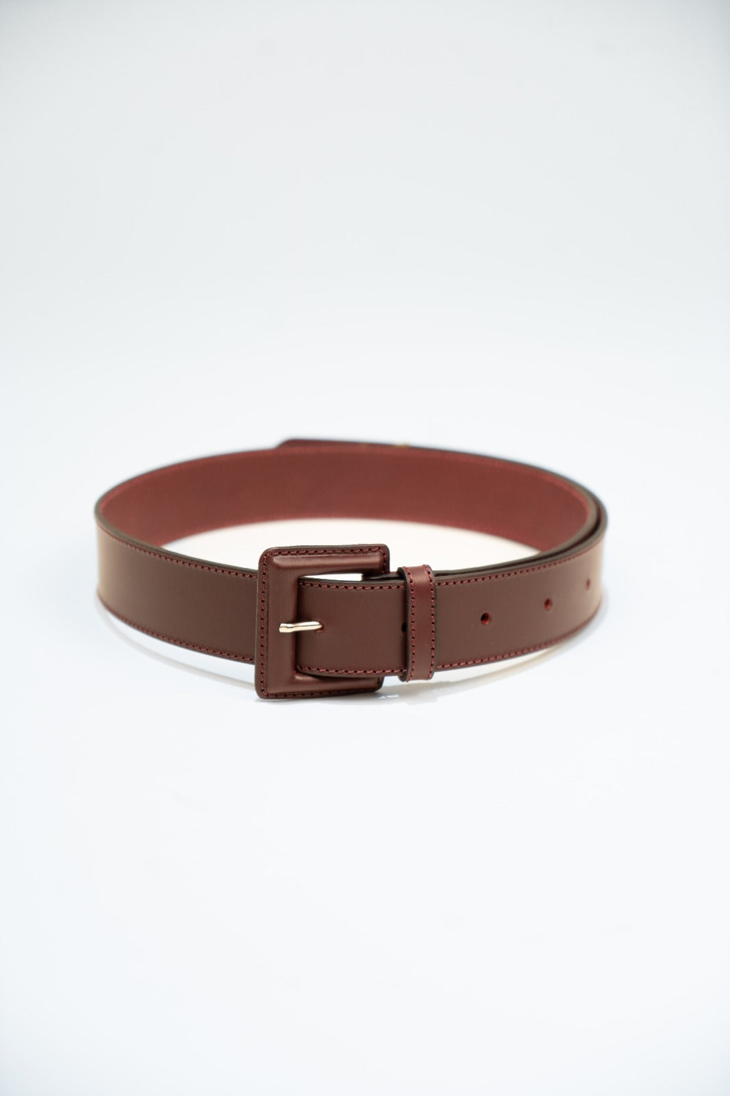 Belt made of burgundy leather. Front closure with leather-covered buckle.