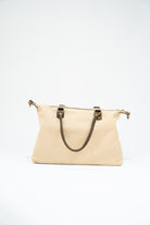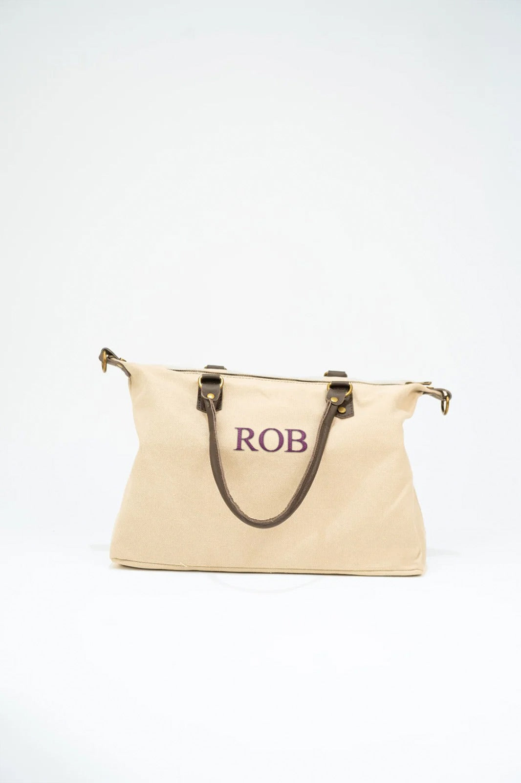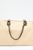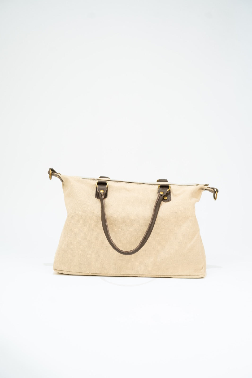 Canvas handbag with fixed leather handles and a removable, adjustable chocolate brown cotton strap. Zip closure, black lining, and interior pocket. Beige.
