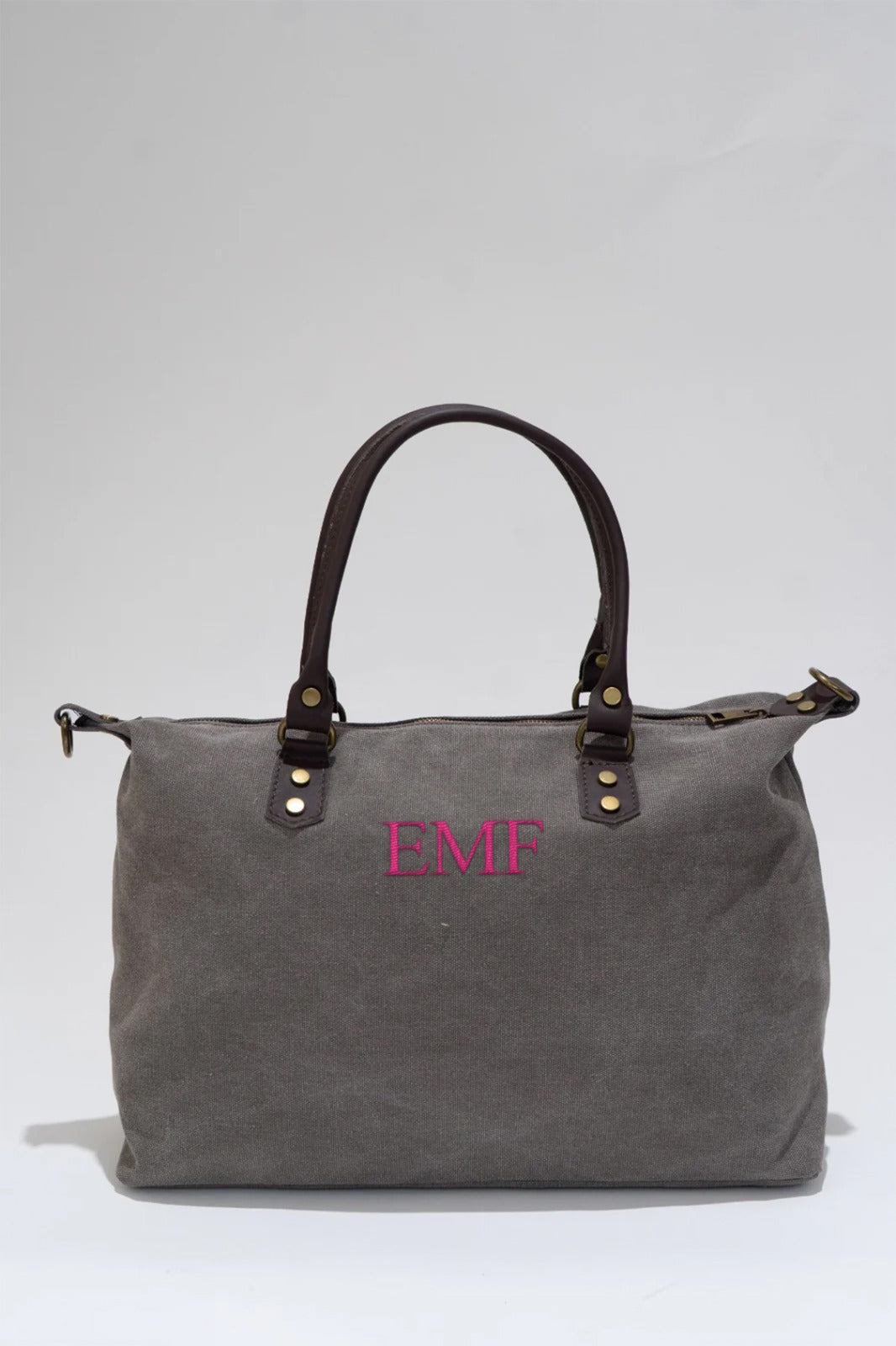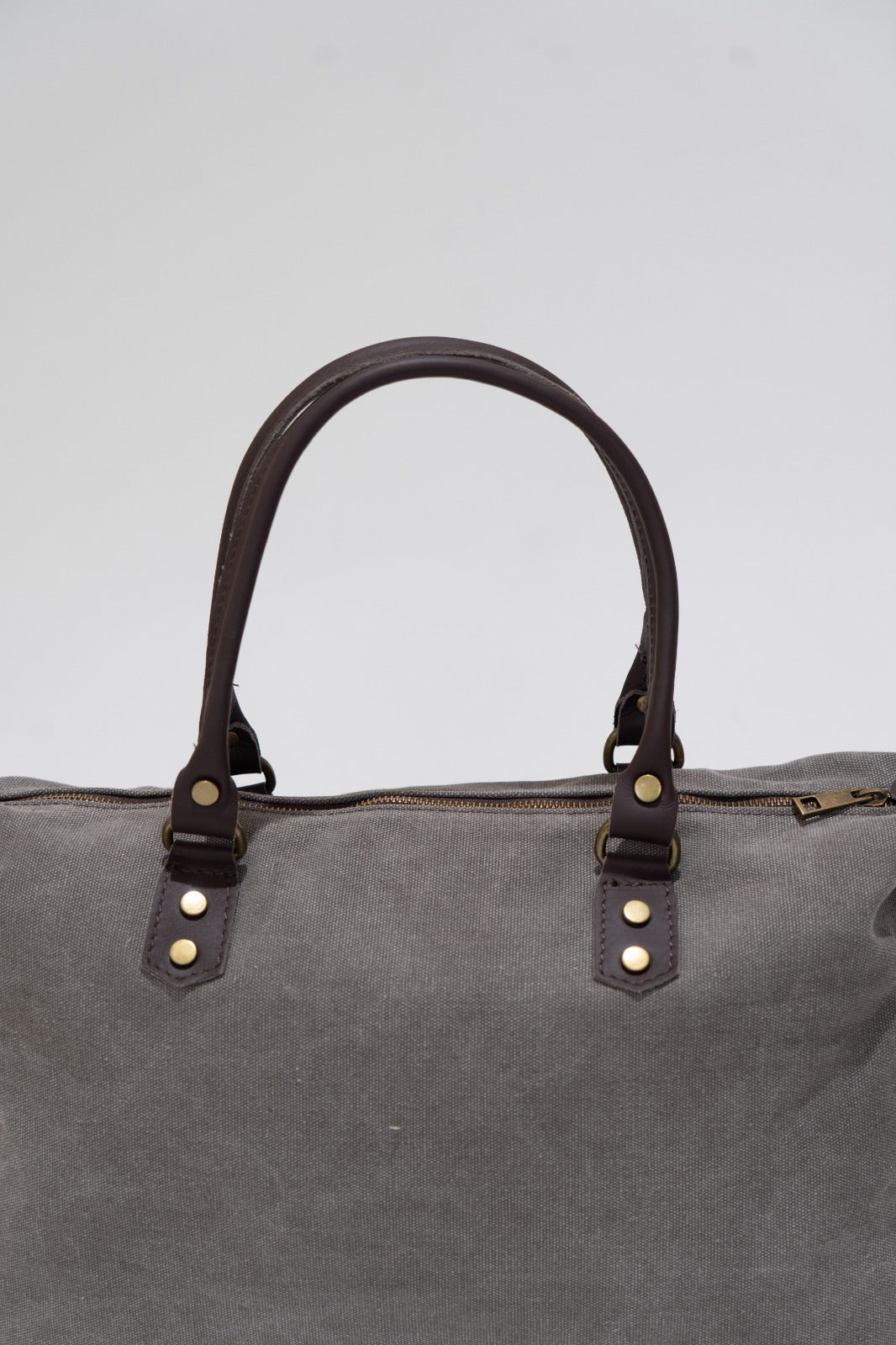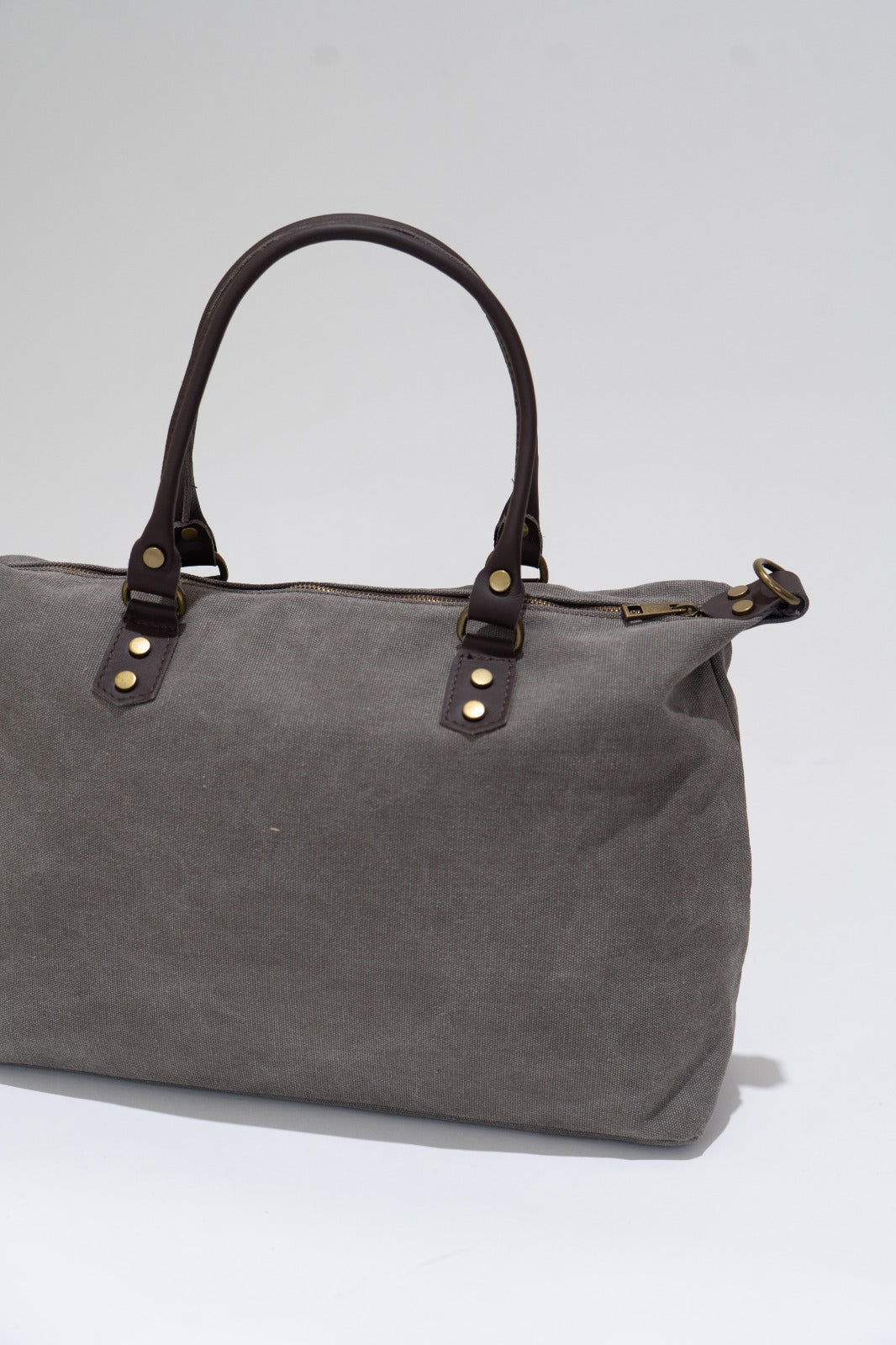 Canvas handbag with fixed leather handles and a removable, adjustable chocolate brown cotton strap. Features a zip closure, black lining, and an interior pocket. Available in gray.