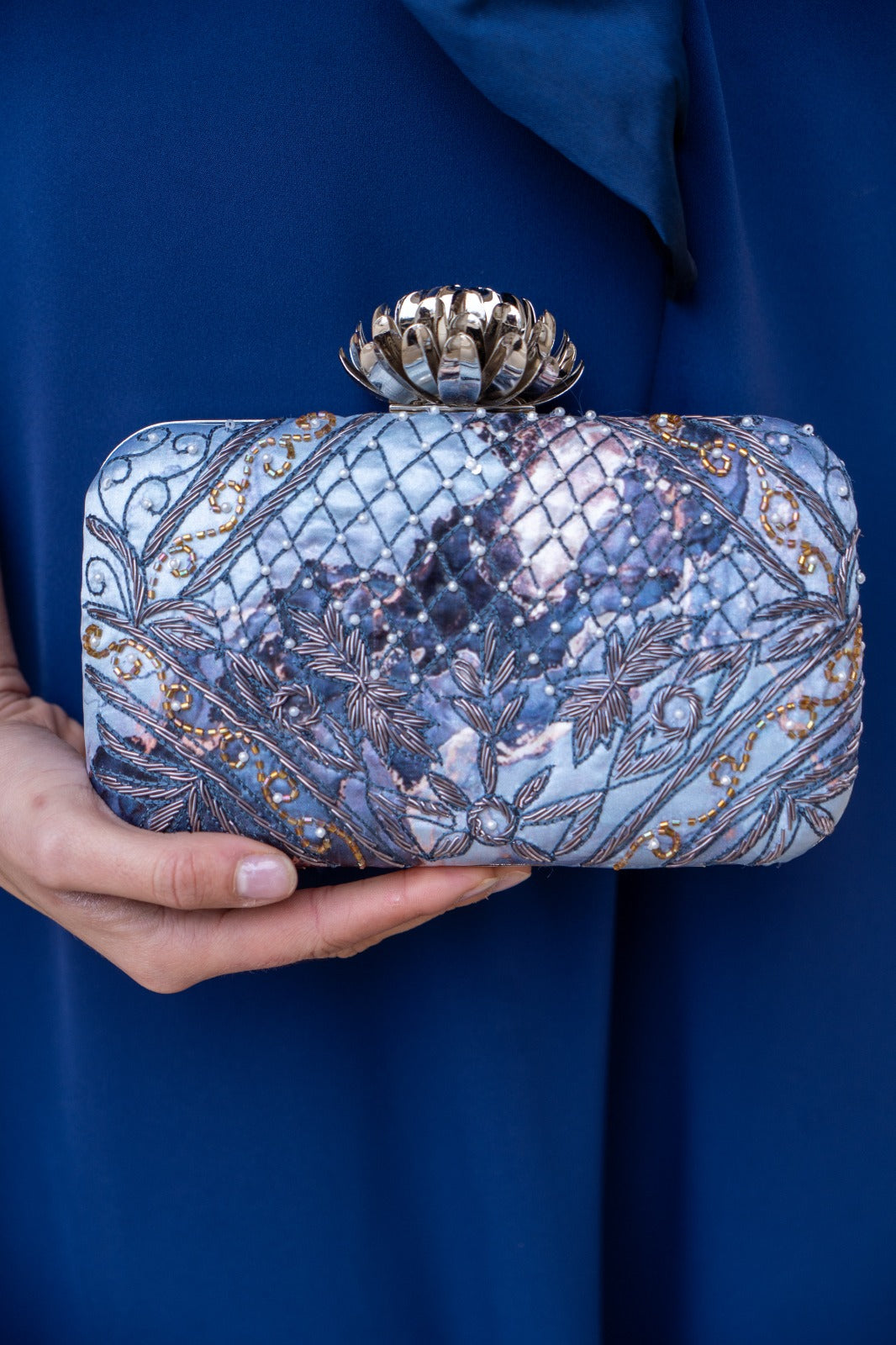 Rigid box with a silver water lily-shaped knob and a long chain for hanging. Decorated with beads in blue, gray, and silver on one side and plain on the other.