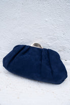 Oval wallet, soft fabric, gold-tone clasp, and chain. In blue.