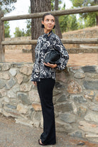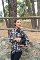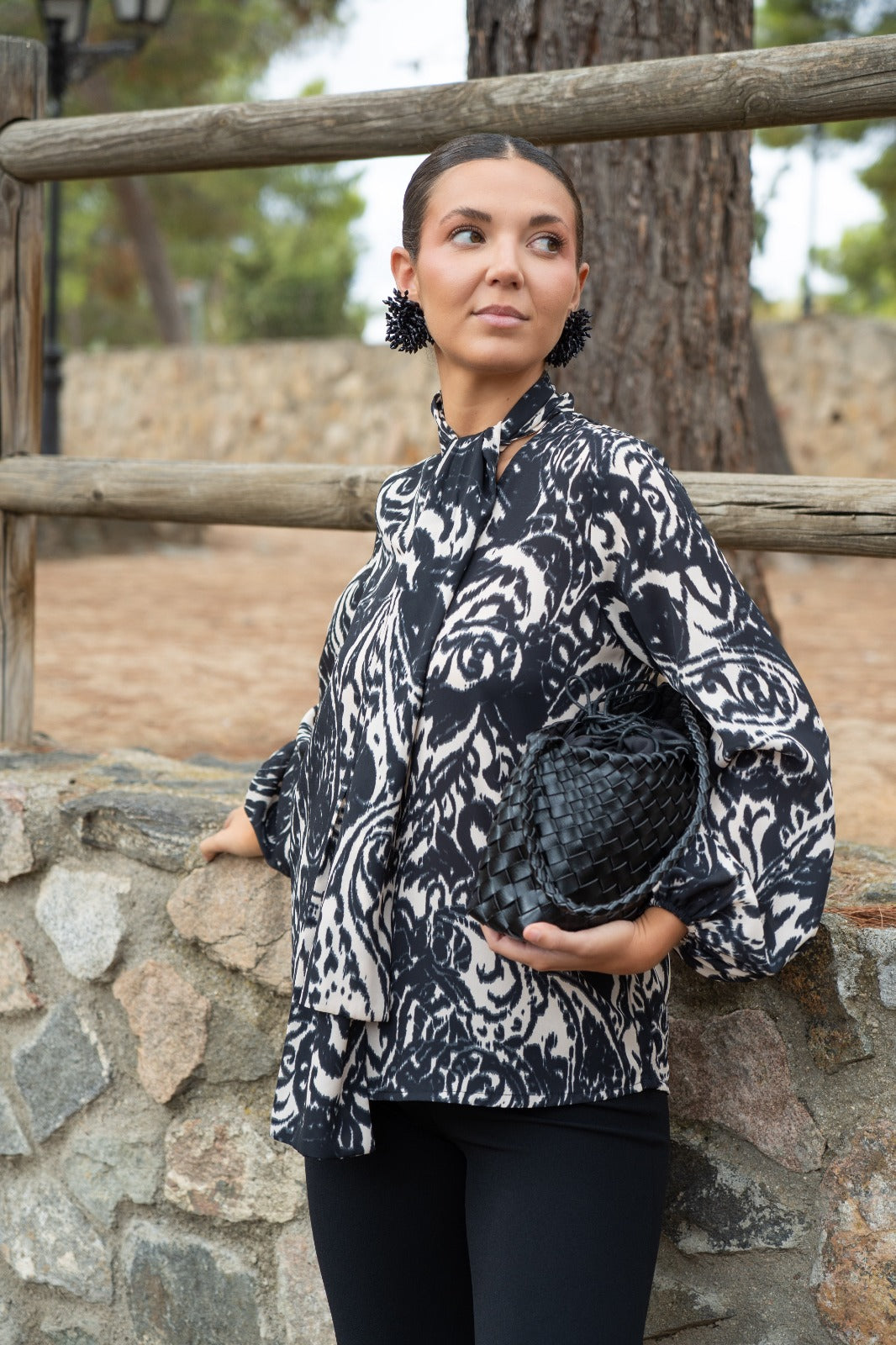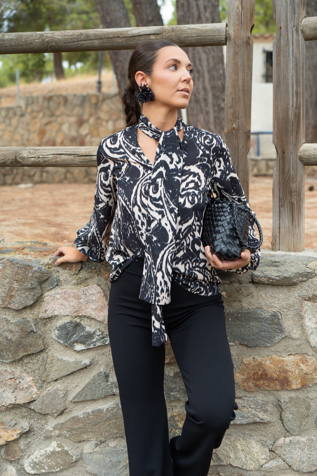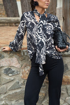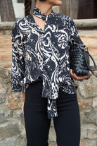 Blouse with a knotted neckline, back tie, and long sleeves with elasticated cuffs. In a beige and black print.