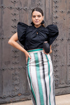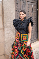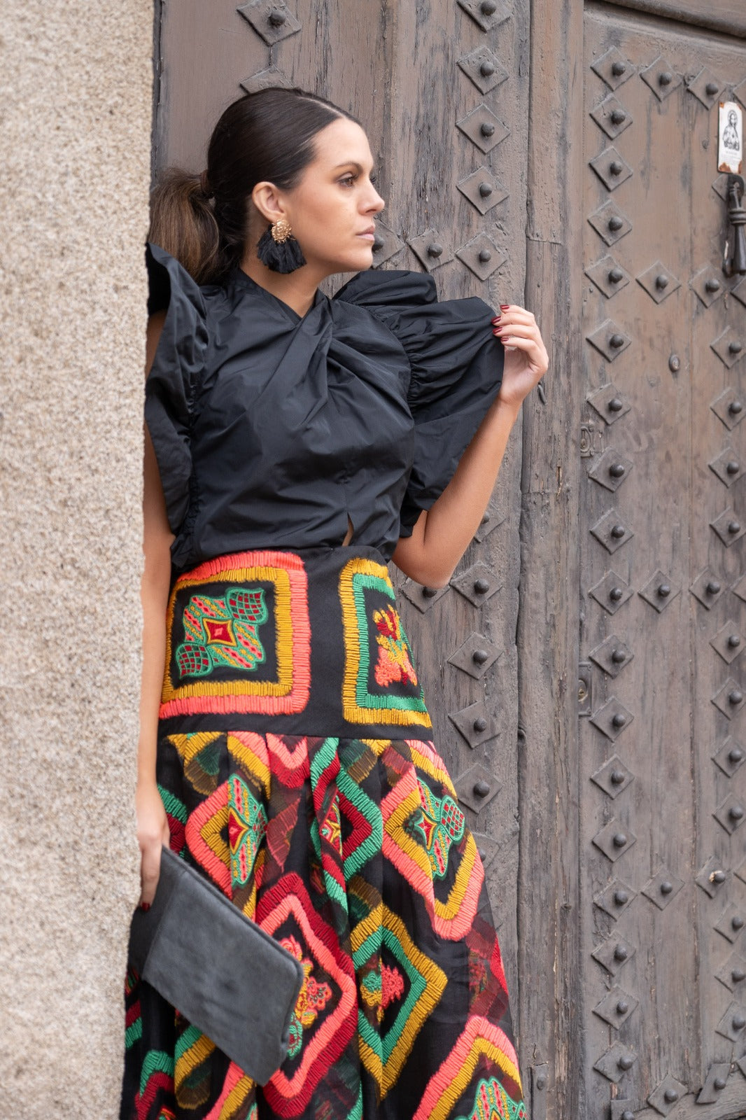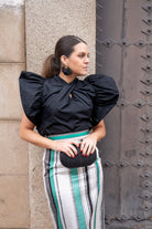 Taffeta shirt with a draped, crossover neckline, pronounced ruffle-like flaps on the shoulders, and a small front slit. In black.