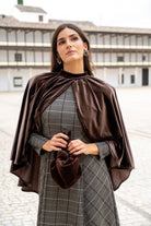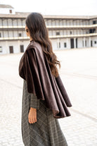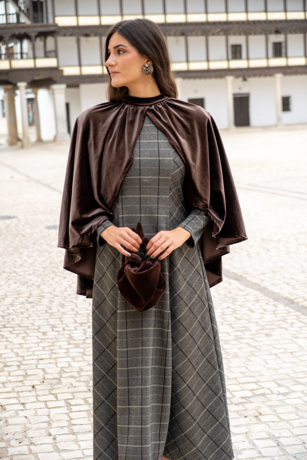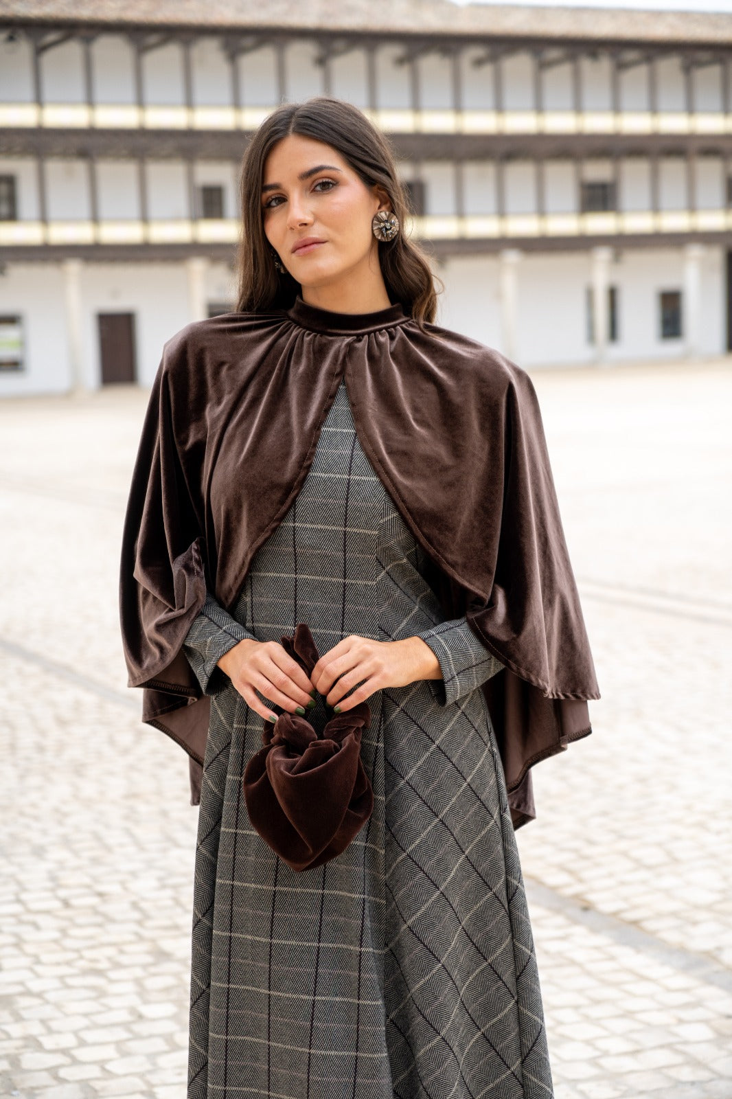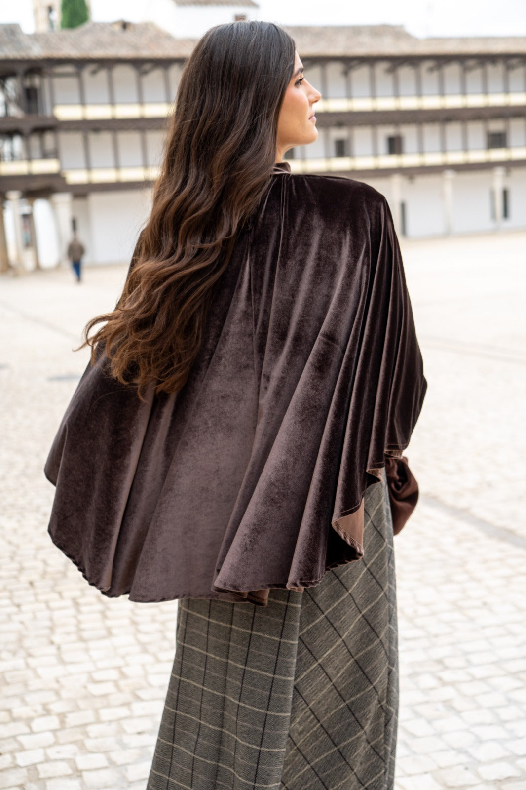 Short cape, in velvet, mock turtleneck, open at the front, closed at the back, fastened with two buttons. In brown.