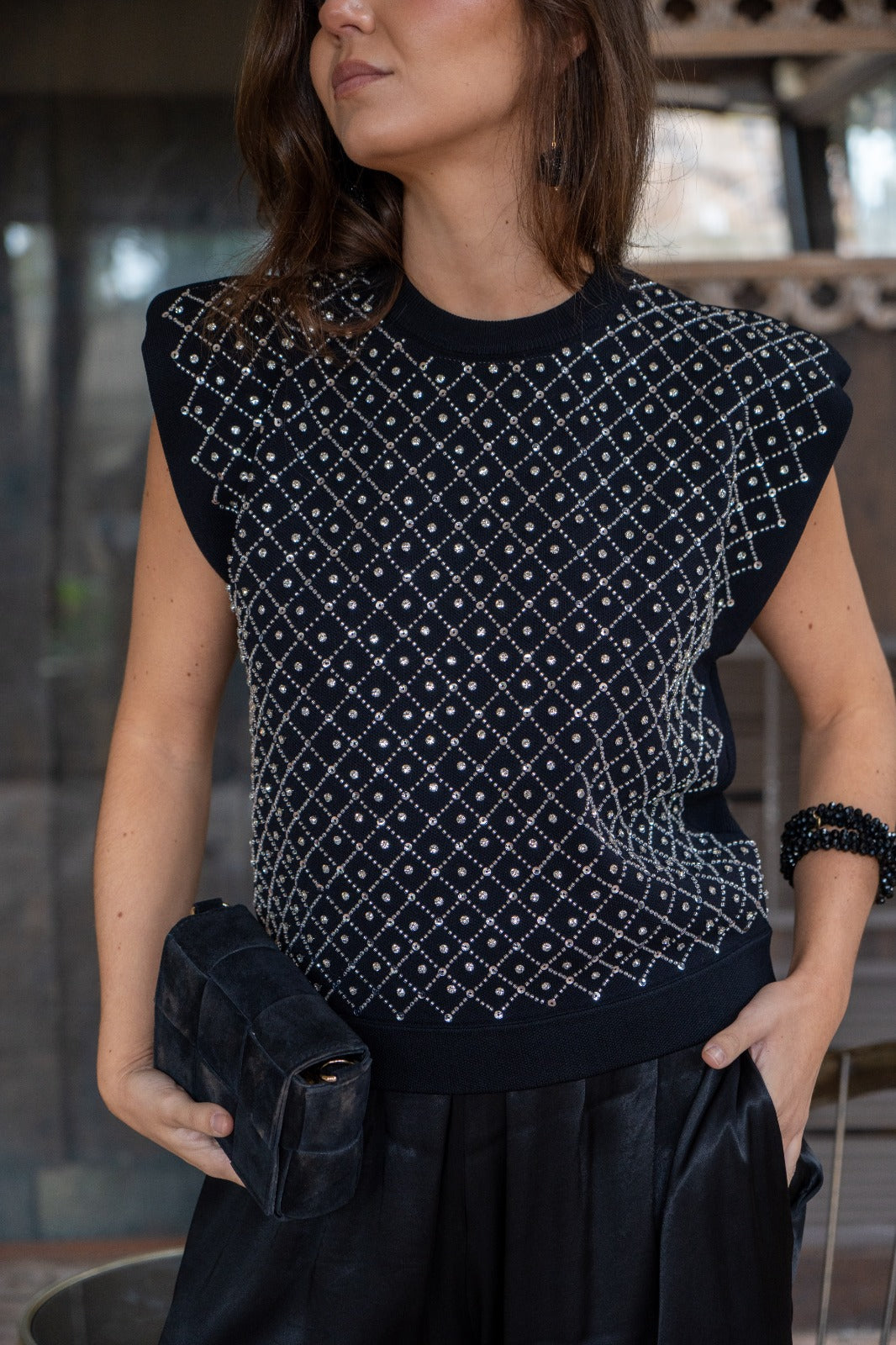 Round neck vest, in black with glitter and silver sequin details on the front, black on the back.