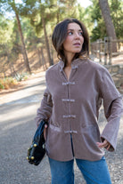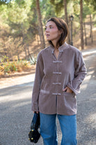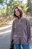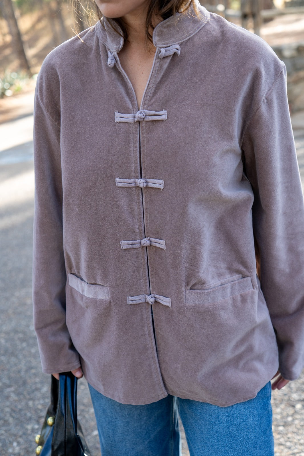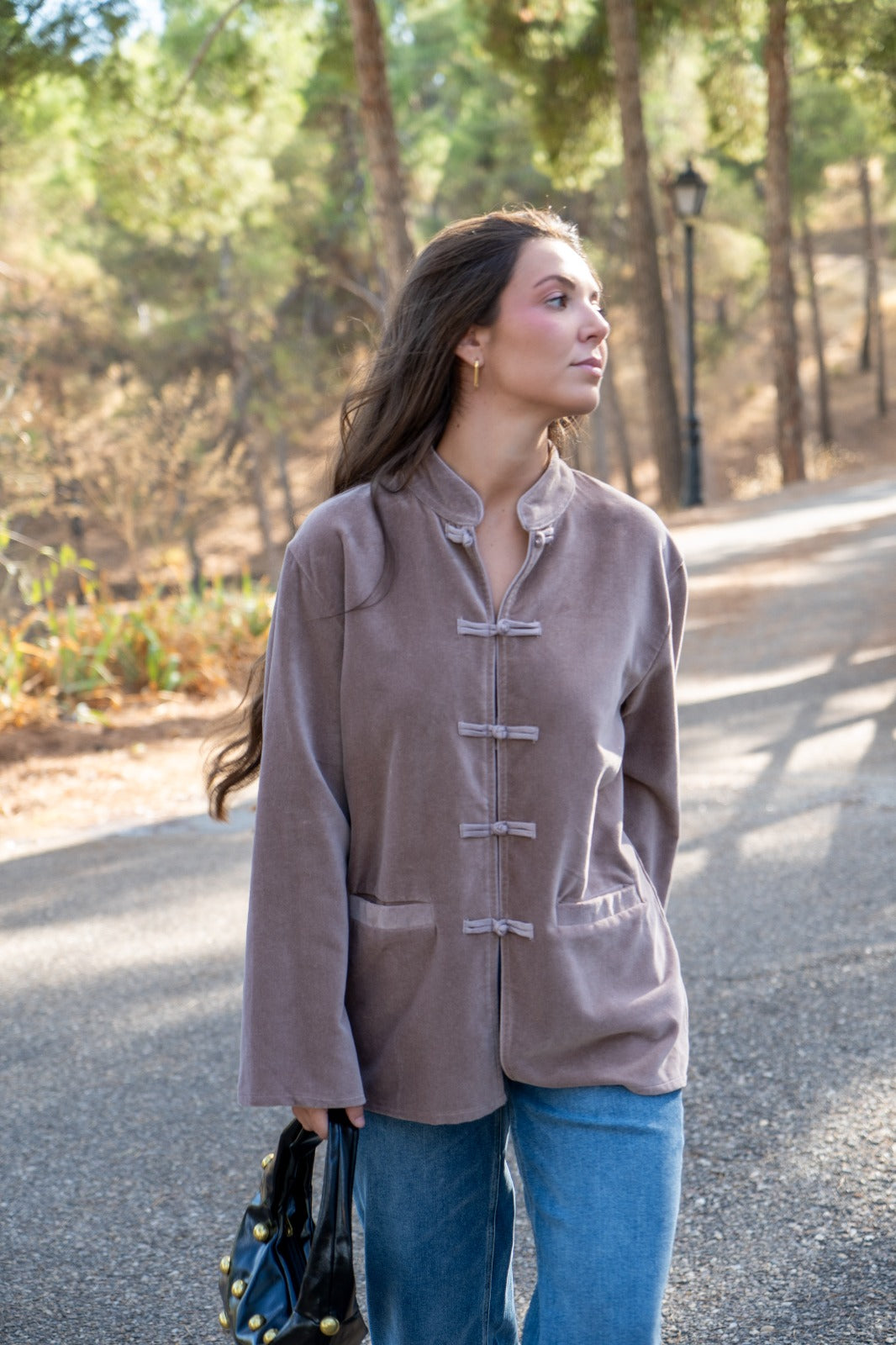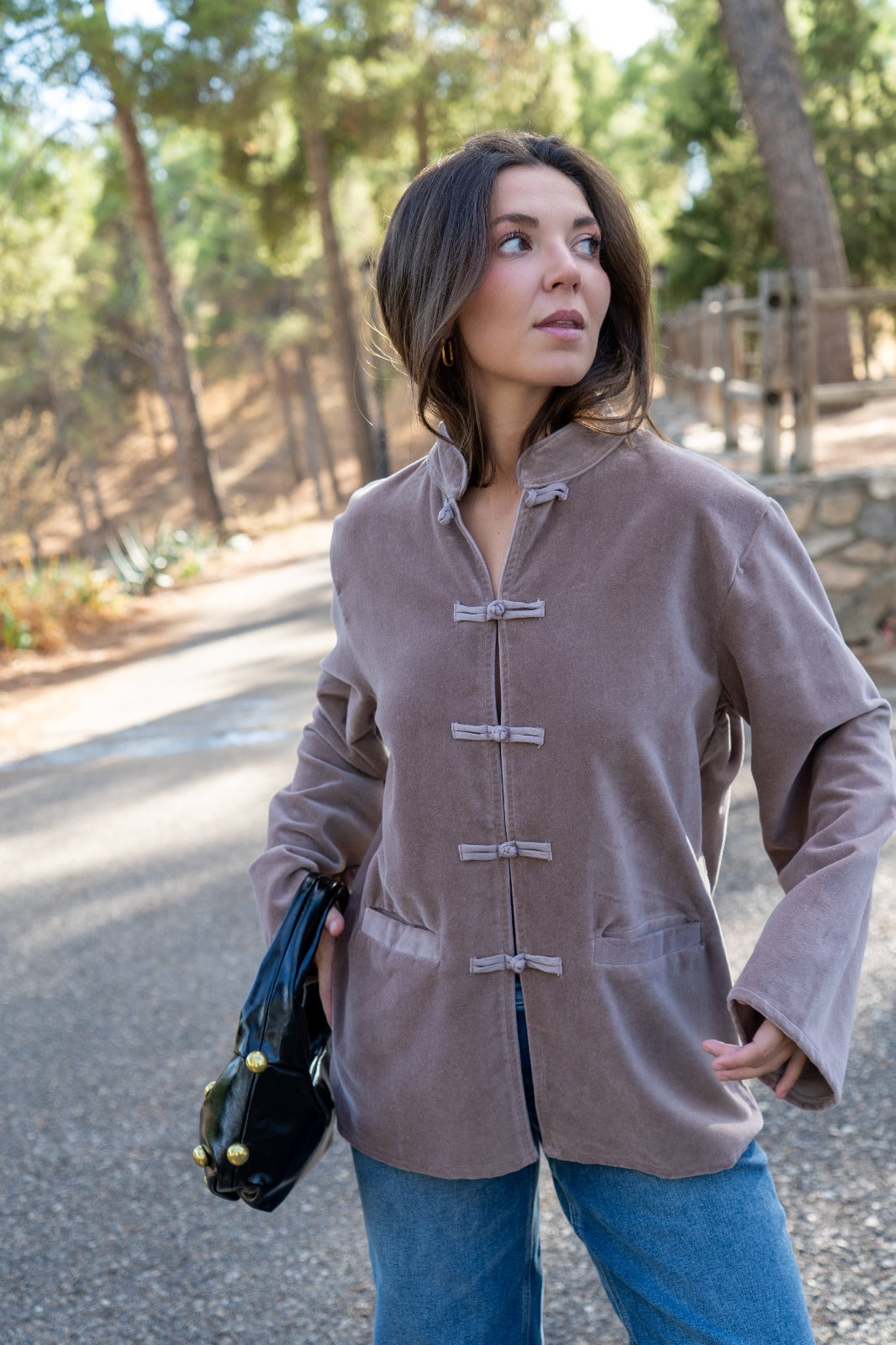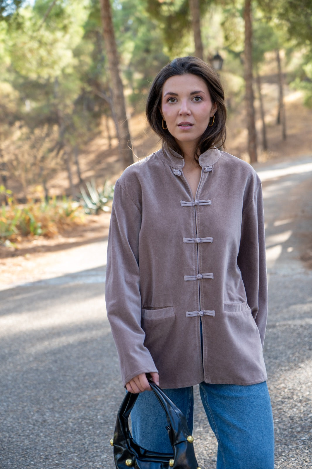 Straight jacket, side slits, long sleeves, front pockets. In taupe velvet.