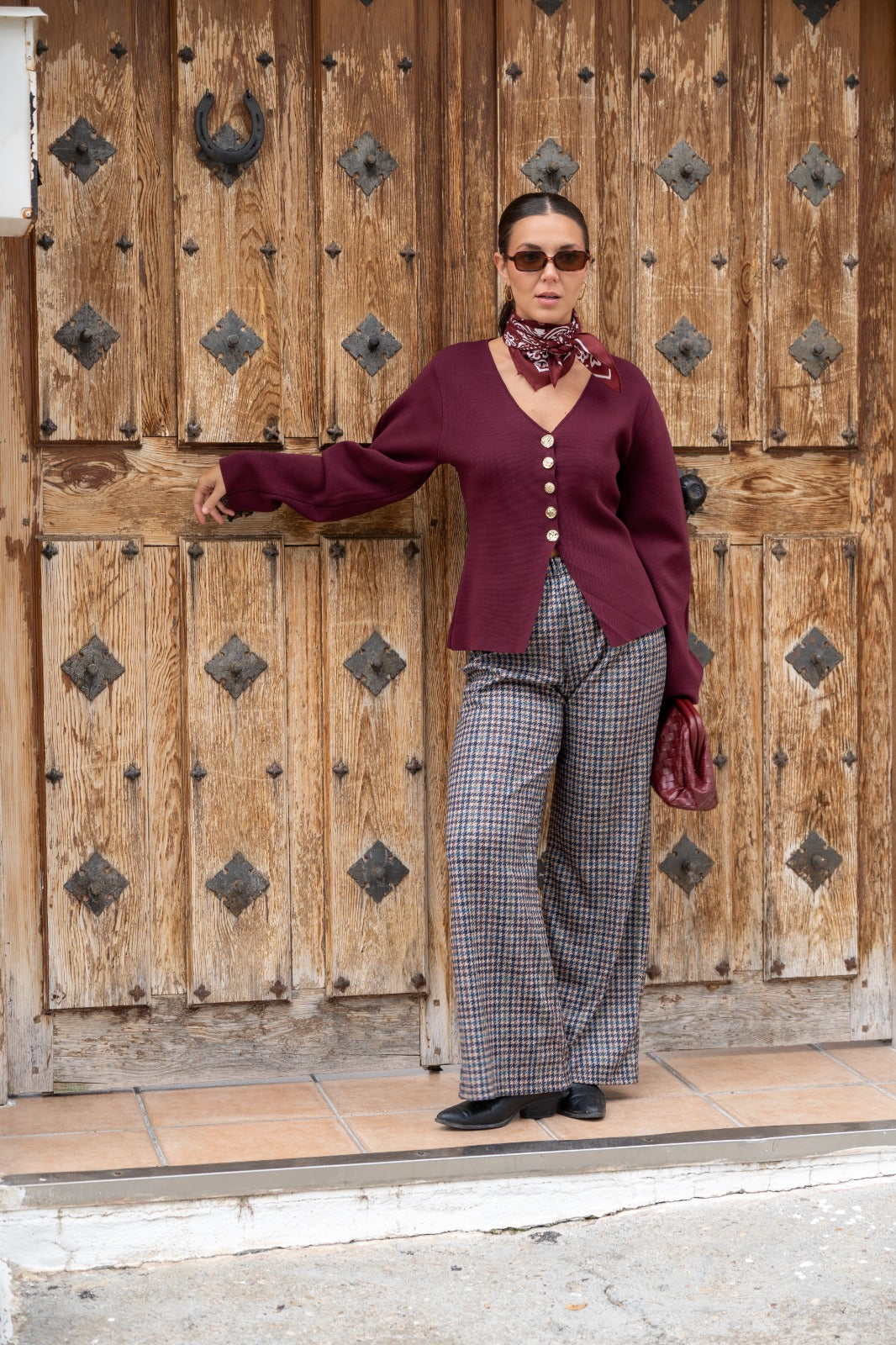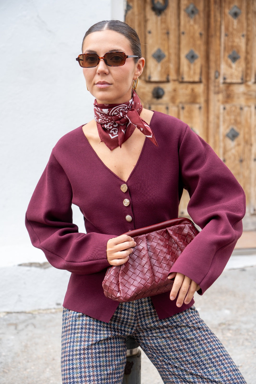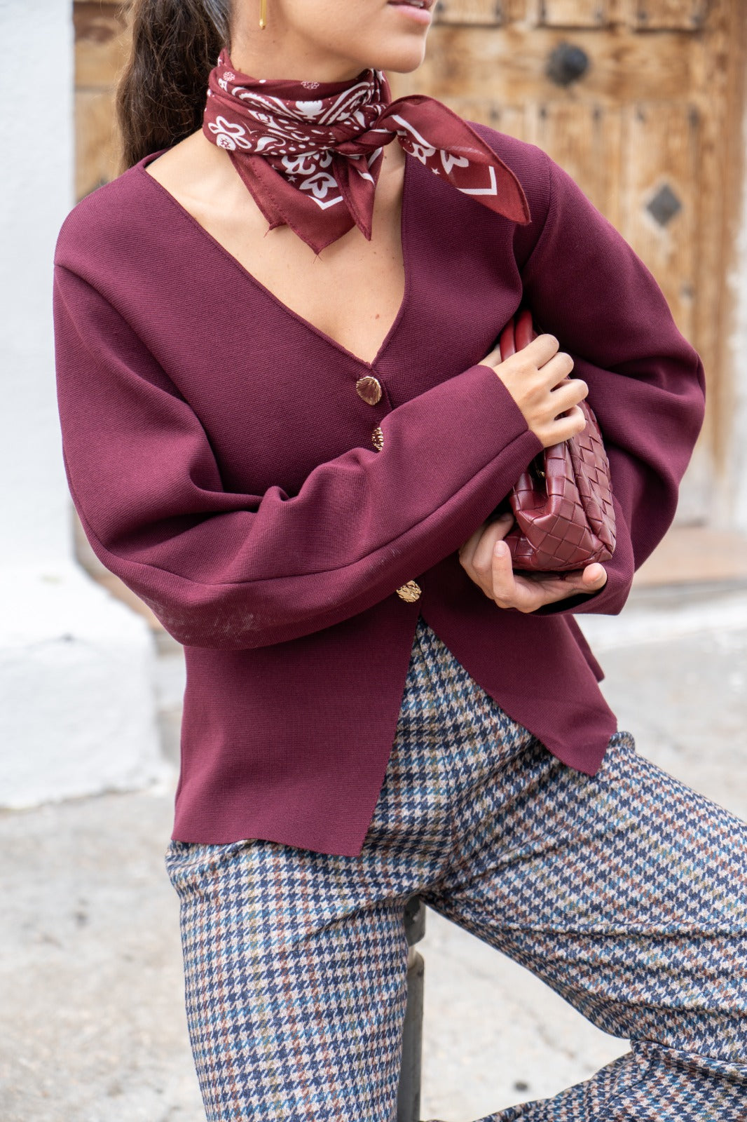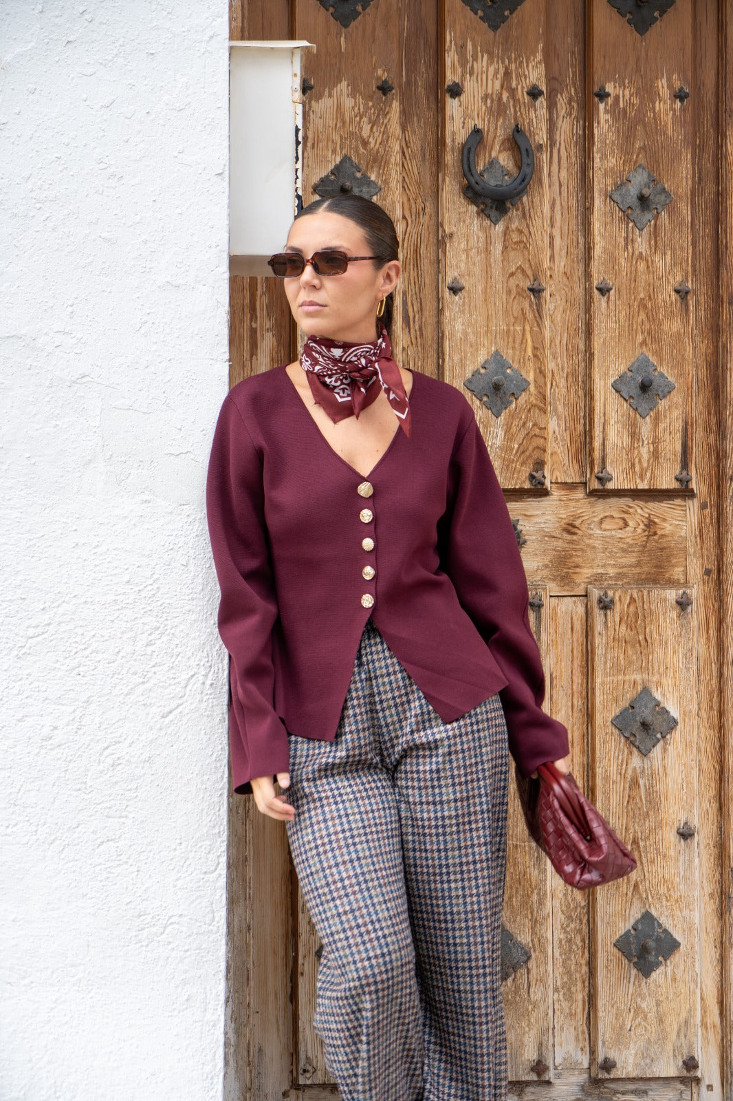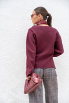 Knit jacket, V-neck, long sleeves, buttoned. In burgundy.