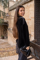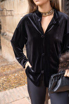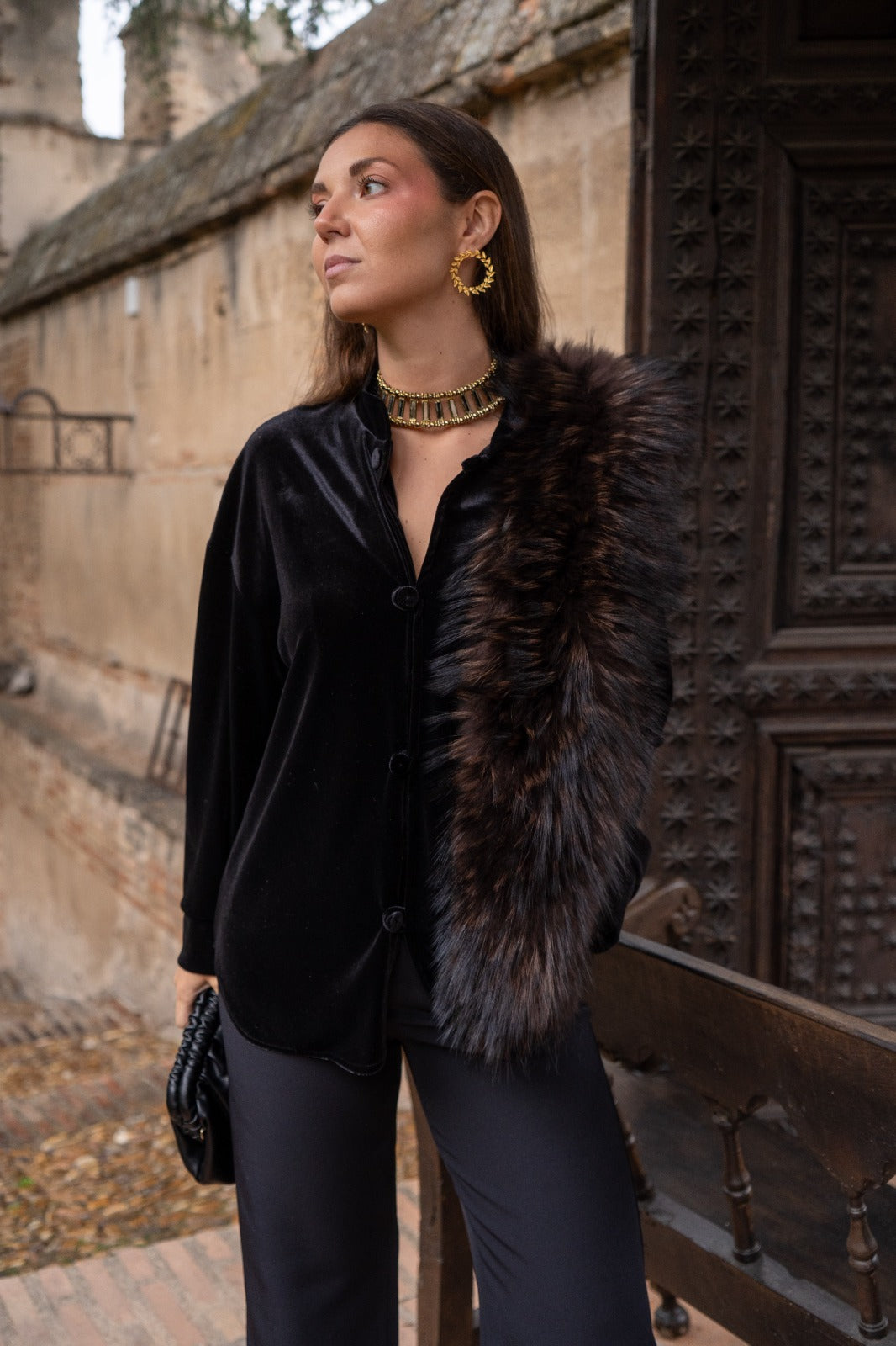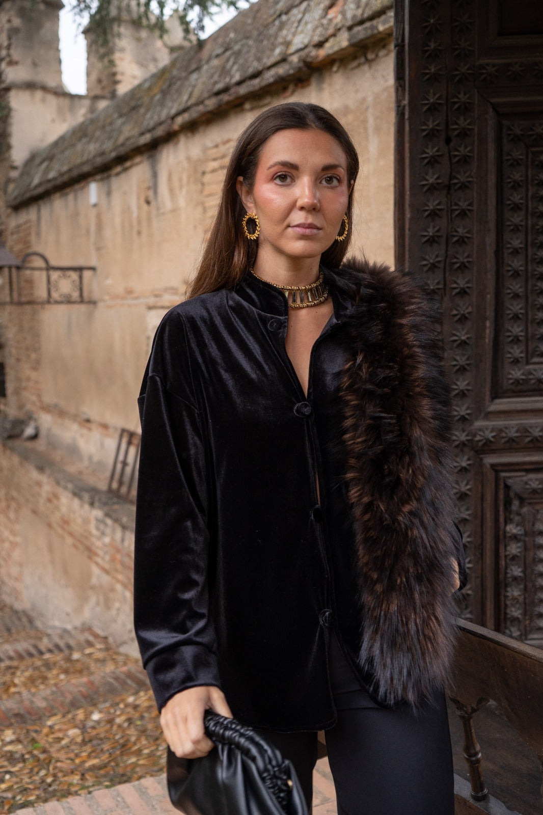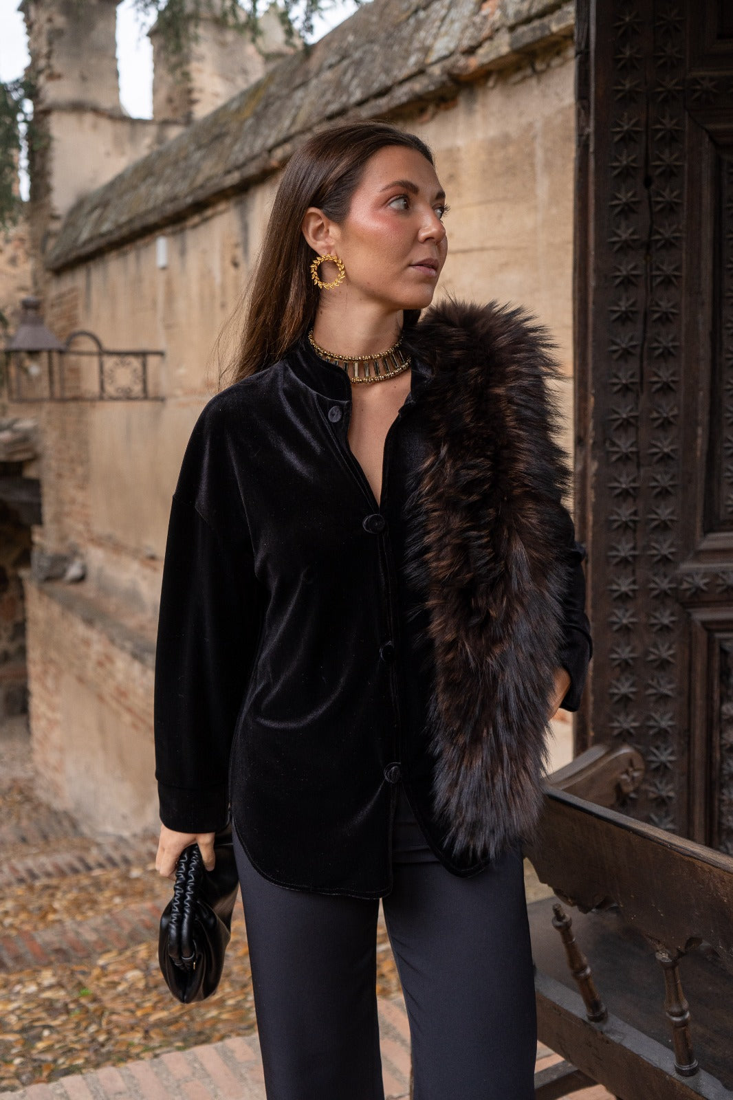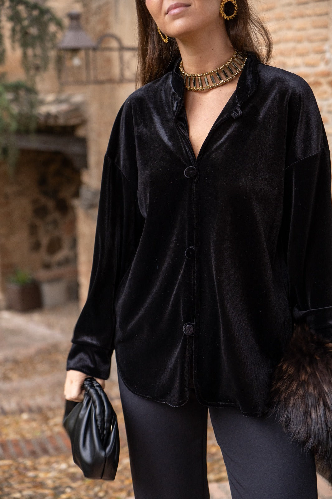 Mandarin collar jacket, long sleeves with cuffs, buttoned, in black velvet.