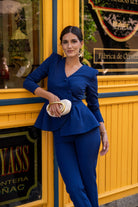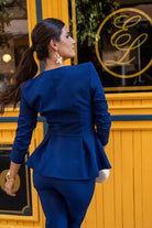 Set consisting of a long-sleeved, double-breasted jacket with buttons and peplum detail. High-waisted trousers with a waistband. In blue.