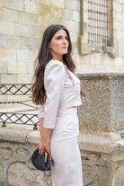 Set consisting of a short jacket with a smoking collar and button-down collar, and a high-waisted pencil skirt with a back slit. In beige with lurex.