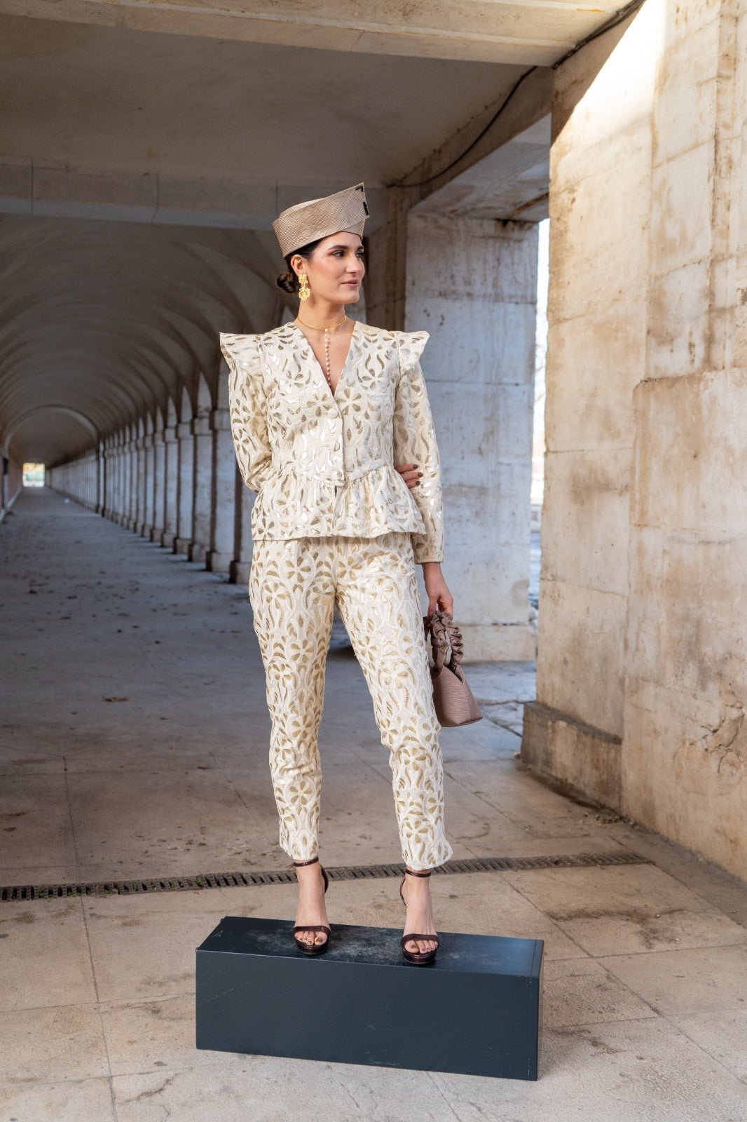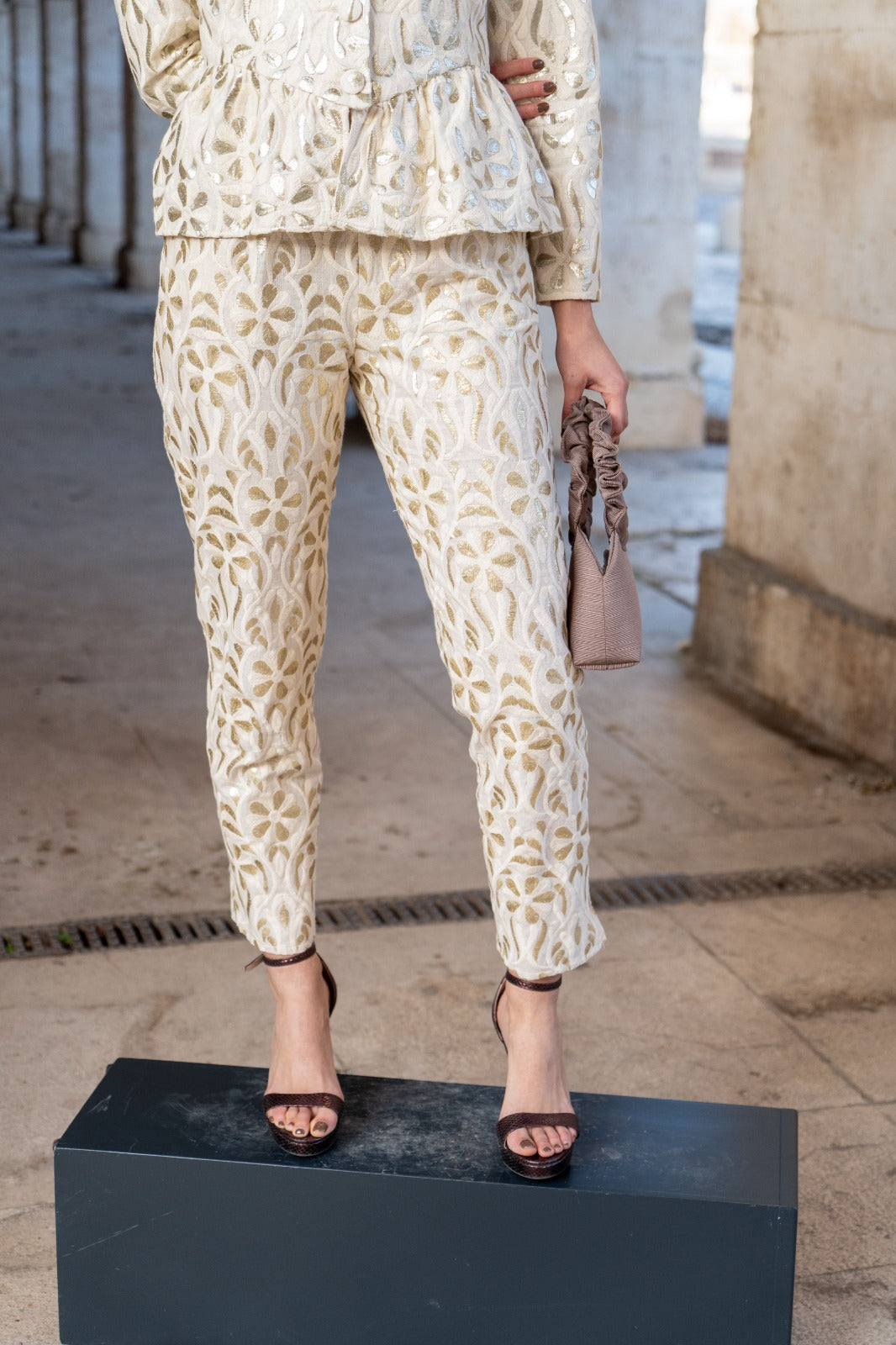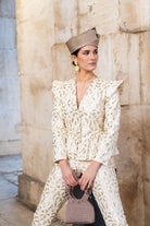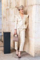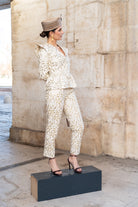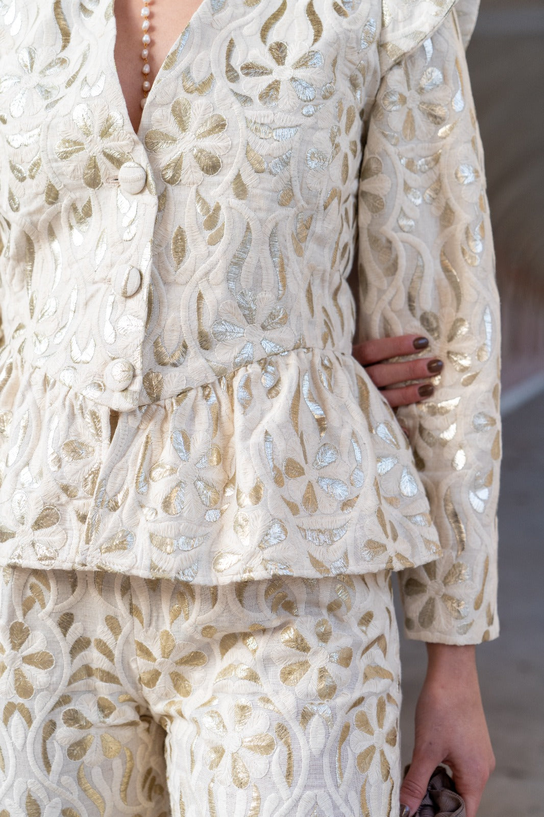 This set includes a fitted jacket with a V-neck and structured shoulders. It features detachable sleeves with an invisible zipper at the armhole, allowing the garment to be transformed into a vest. The trousers are straight-leg with side pockets and pleats. The ivory embroidery features delicate raised floral motifs.