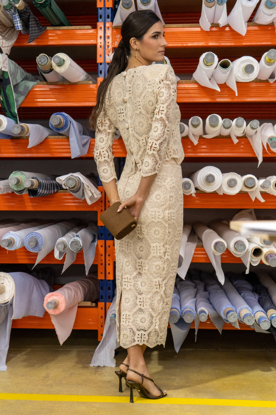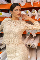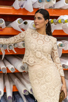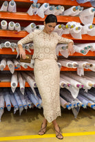 Set consisting of a round-neck blouse with three-quarter sleeves, button closure at the back, and a high-waisted skirt with a back slit. Made of beige crochet with a shimmery finish.