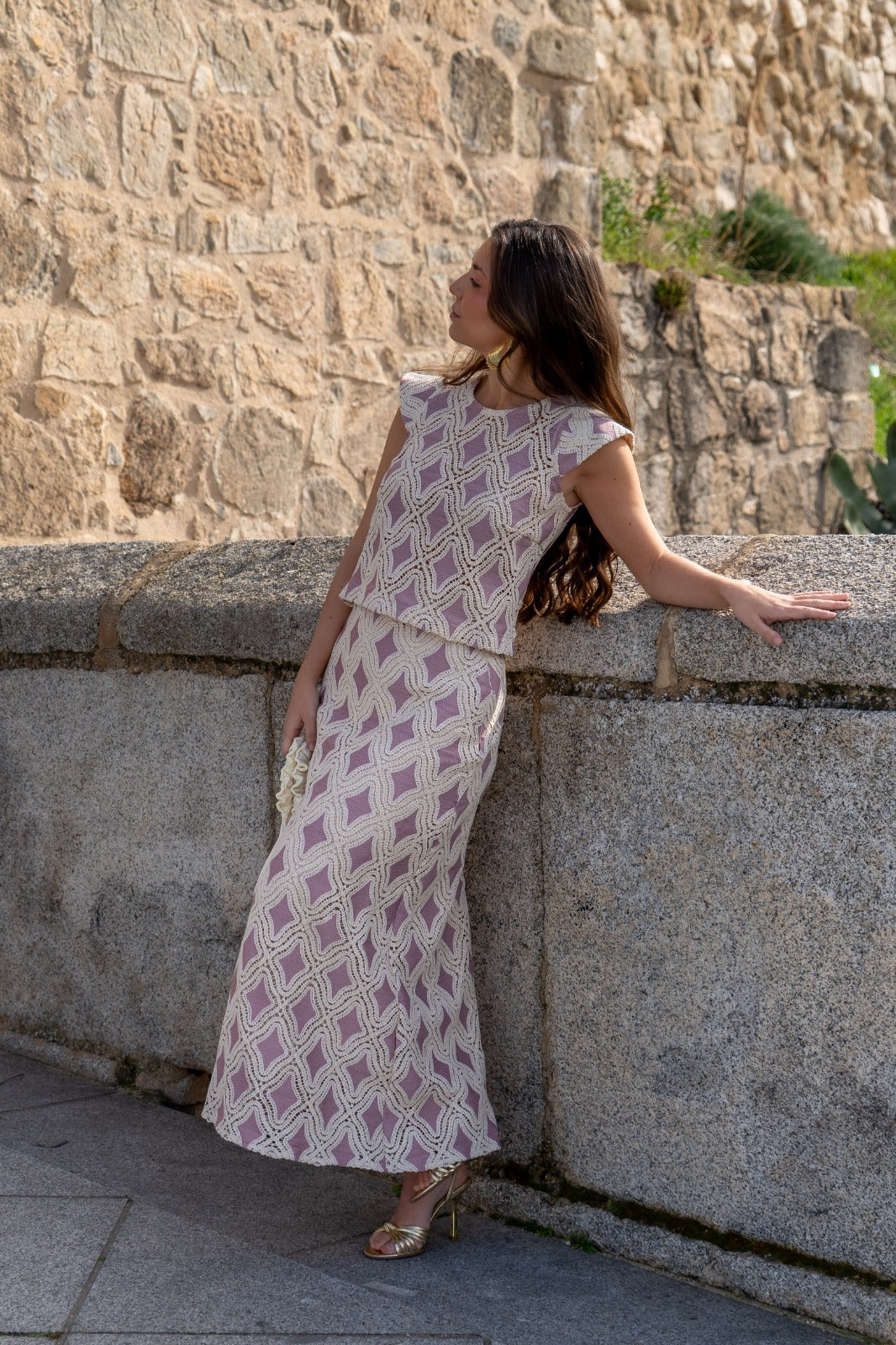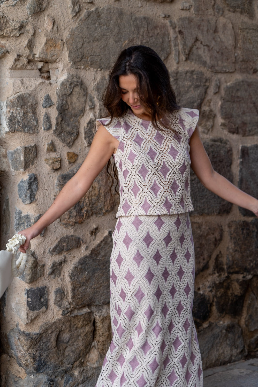 Conjunto compuesto por blusa escote redondo, sin mangas y falda alta con cintura, abertura trasera. En crochet beige y rosa.