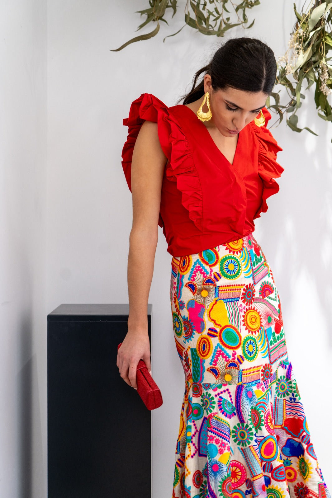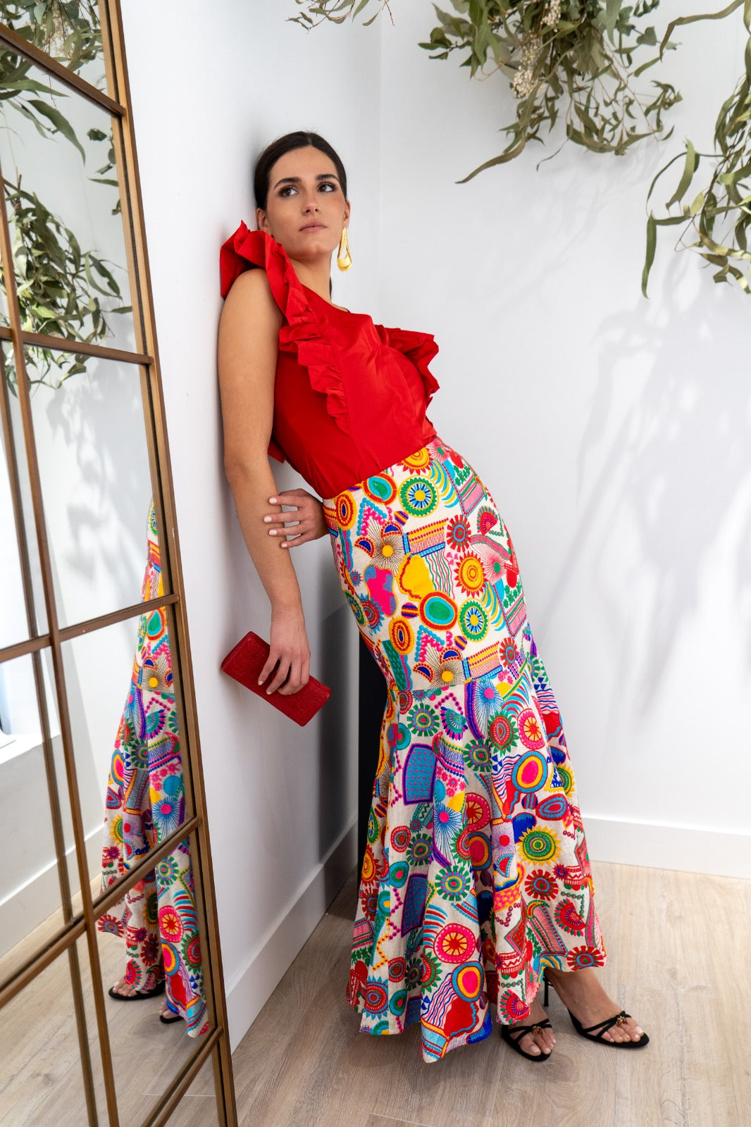 Conjunto compuesto por blusa sin mangas, escote a pico y falda bordada corte evasé con cintura alta y caída fluida. En color rojo y multicolor.