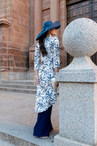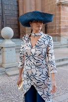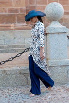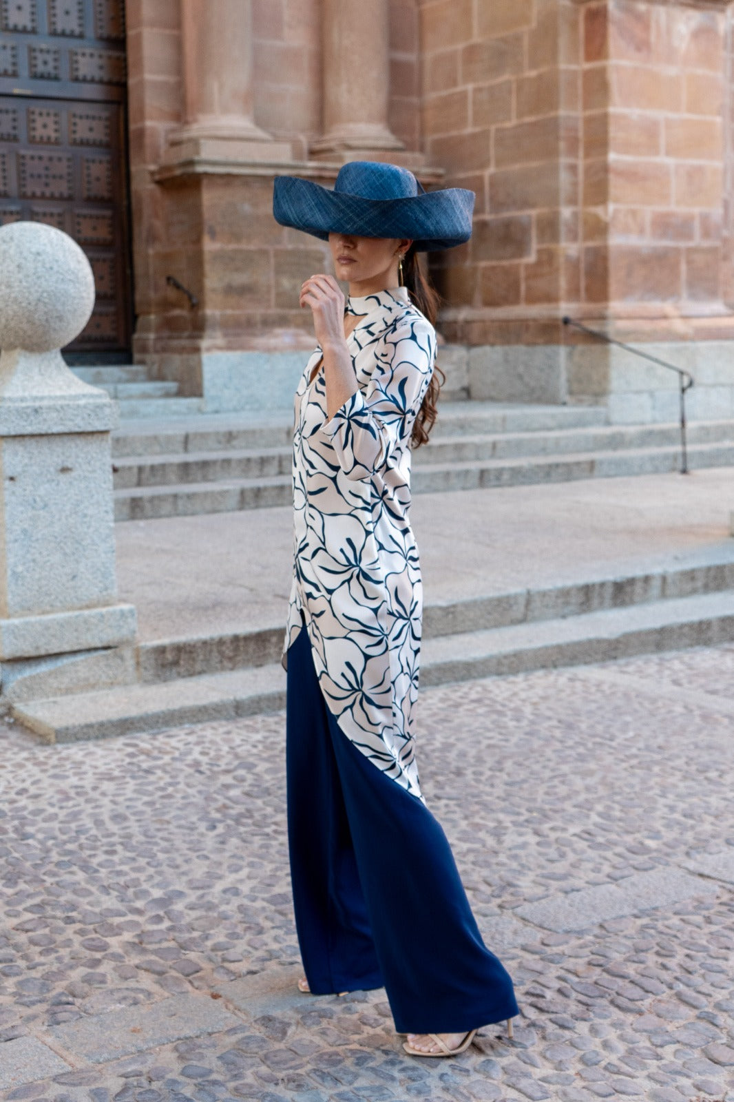 Conjunto compuesto por casaca escote a pico y tira pegado al cuello, manga francesa, desigual, mas largo por detrás y pantalón, cintura, recto. En color beige y azul marino.