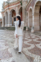 A matching set consisting of a double-breasted jacket with long, puffed sleeves and straight-leg, high-waisted trousers. In beige with brocade detailing.