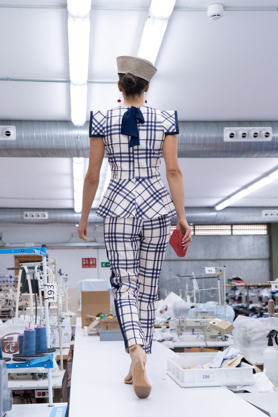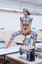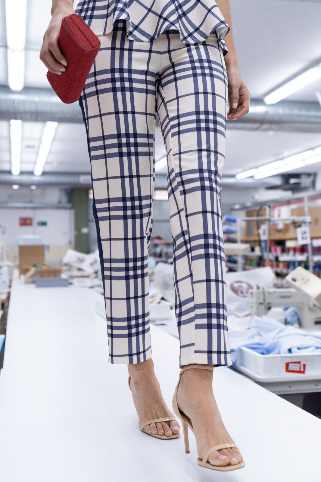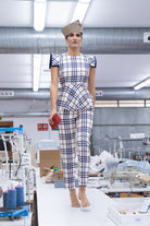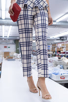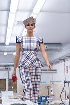 A matching set consisting of a sleeveless, round-neck blouse with a shoulder detail, a ruffled waist, and high-waisted, slim-fit trousers. Beige with navy checks.