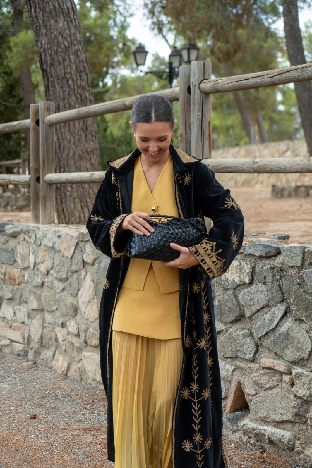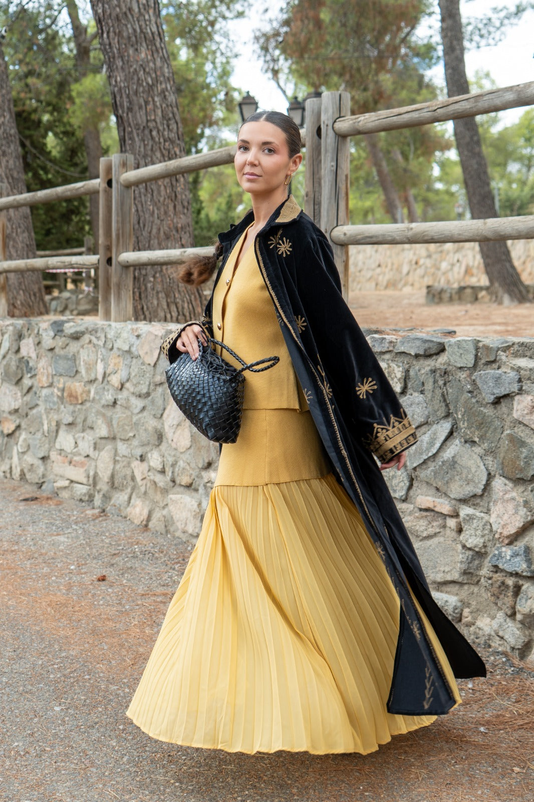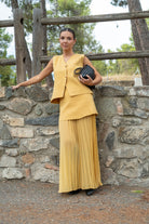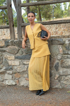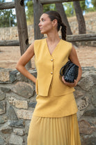 Knit set, consisting of a V-neck button-up vest and a knit skirt with pleats at the bottom. In mustard yellow.
