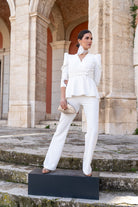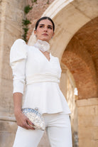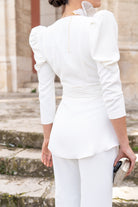 Outfit consisting of a double-breasted jacket with buttons, long puff sleeves and high-waisted trousers, zipper on one side in white.