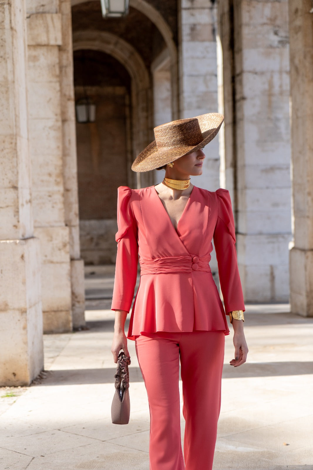 Set consisting of a double-breasted jacket with buttons, long puff sleeves and high-waisted trousers, zipper on one side in coral color.