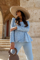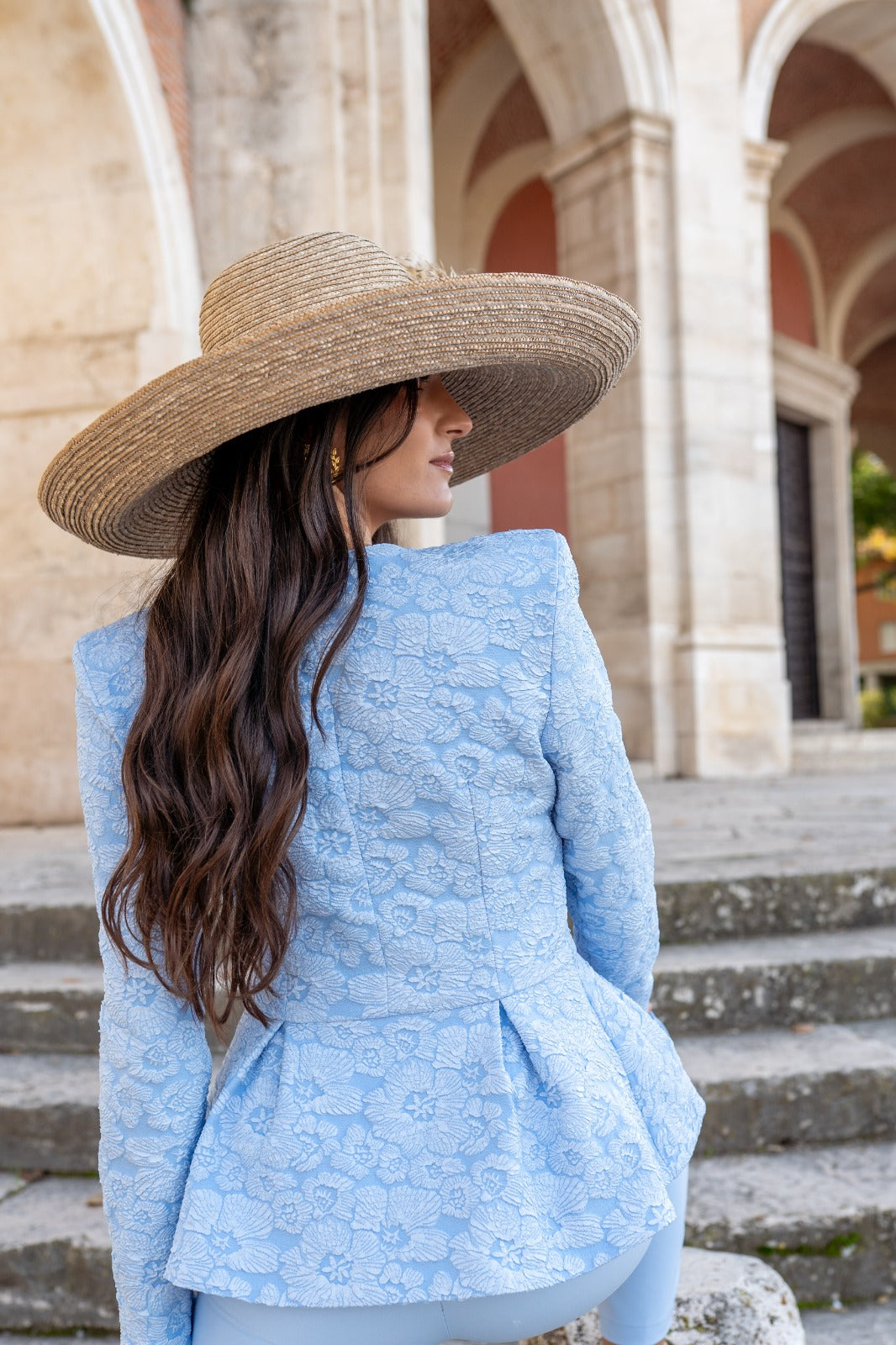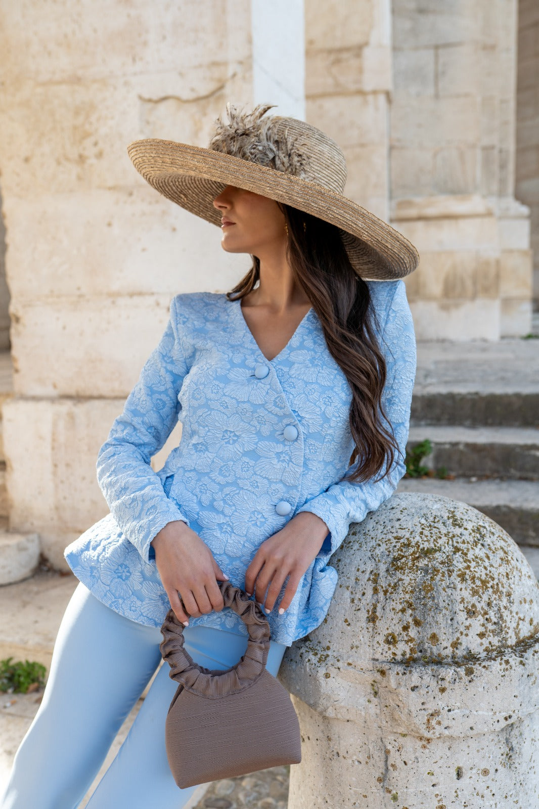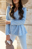 Set consisting of a brocade jacket with long sleeves, double-breasted with buttons and peplum. Trousers with a high waist. In blue.