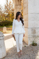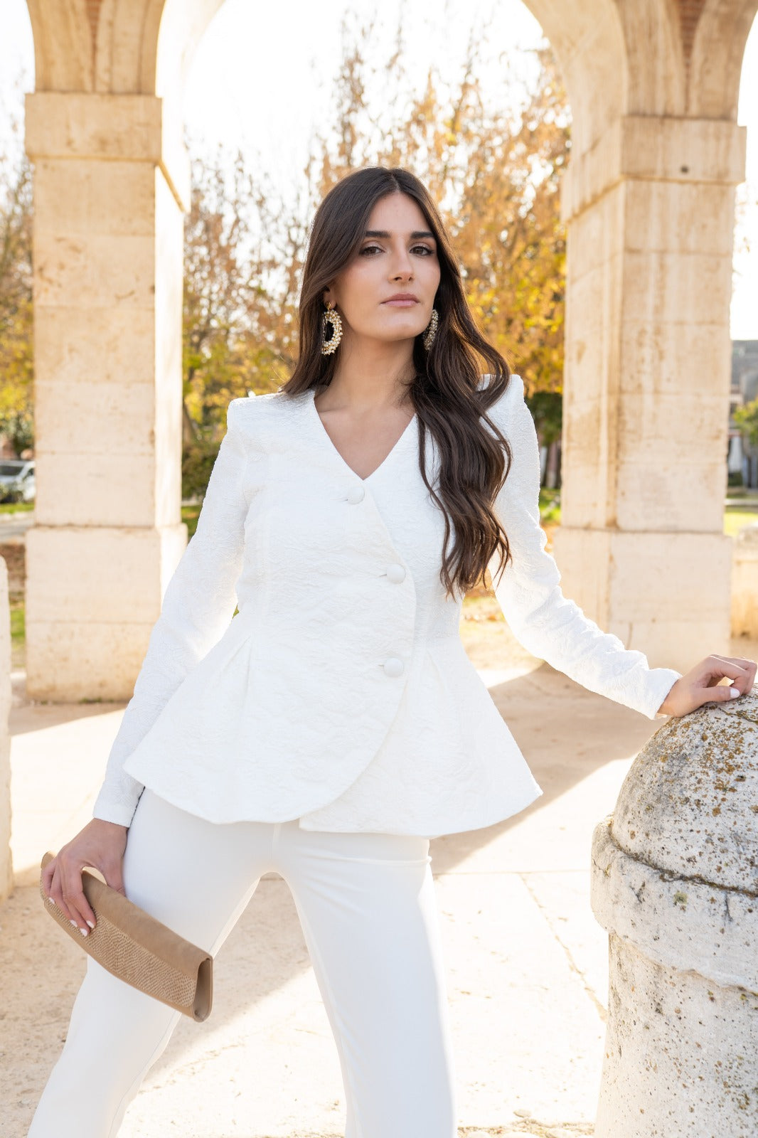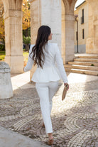 Set consisting of a brocade jacket with long sleeves, double-breasted with buttons and peplum. Trousers with a high waist. In white.