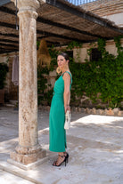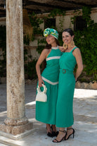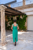 Set featuring a square-neck top, wide shoulder pads, and a high-waisted skirt with buckle detailing and a slit in the back. In green.