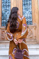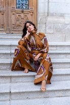 Set consisting of a sleeveless, gathered-collar shirt, a long-sleeved overshirt, and wide-leg, high-waisted trousers. In brown with a print.