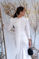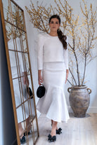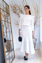Set consisting of a round neck top with long sleeves, button closure at the back, tie at the neck, and a high-waisted, mermaid-style skirt with an asymmetrical ruffle. In white.