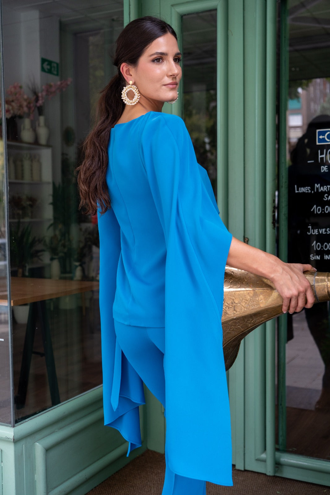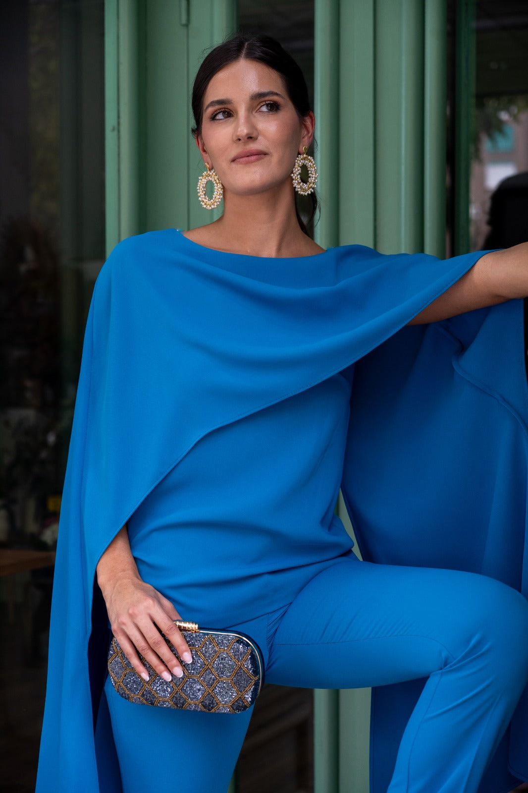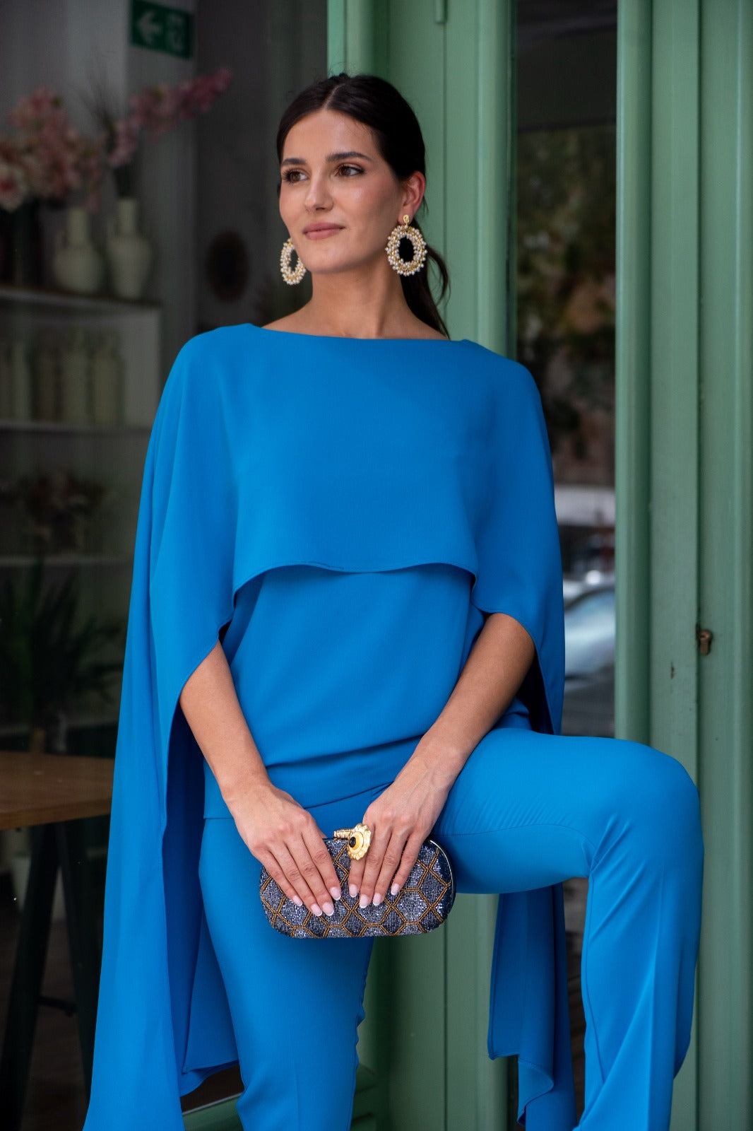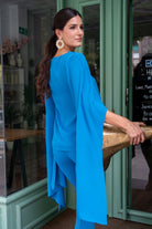 Set consisting of a top with wide shoulder pads and a layered overlay, and high-waisted, narrow-fitting trousers with a zipper. In blue.