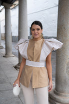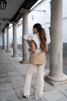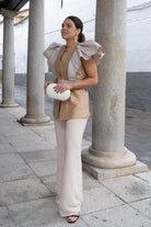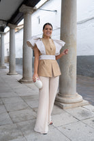 Set featuring a taffeta vest with a round neckline, plunging sleeves, a sash at the waist, and chiffon trousers with a high waist and a back zipper. Two-tone beige.