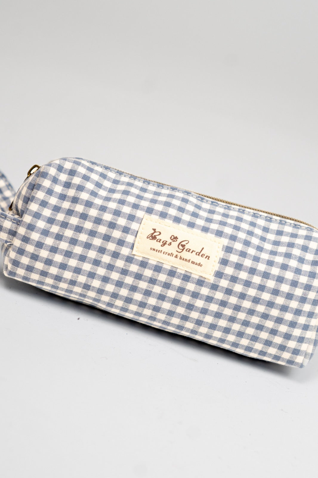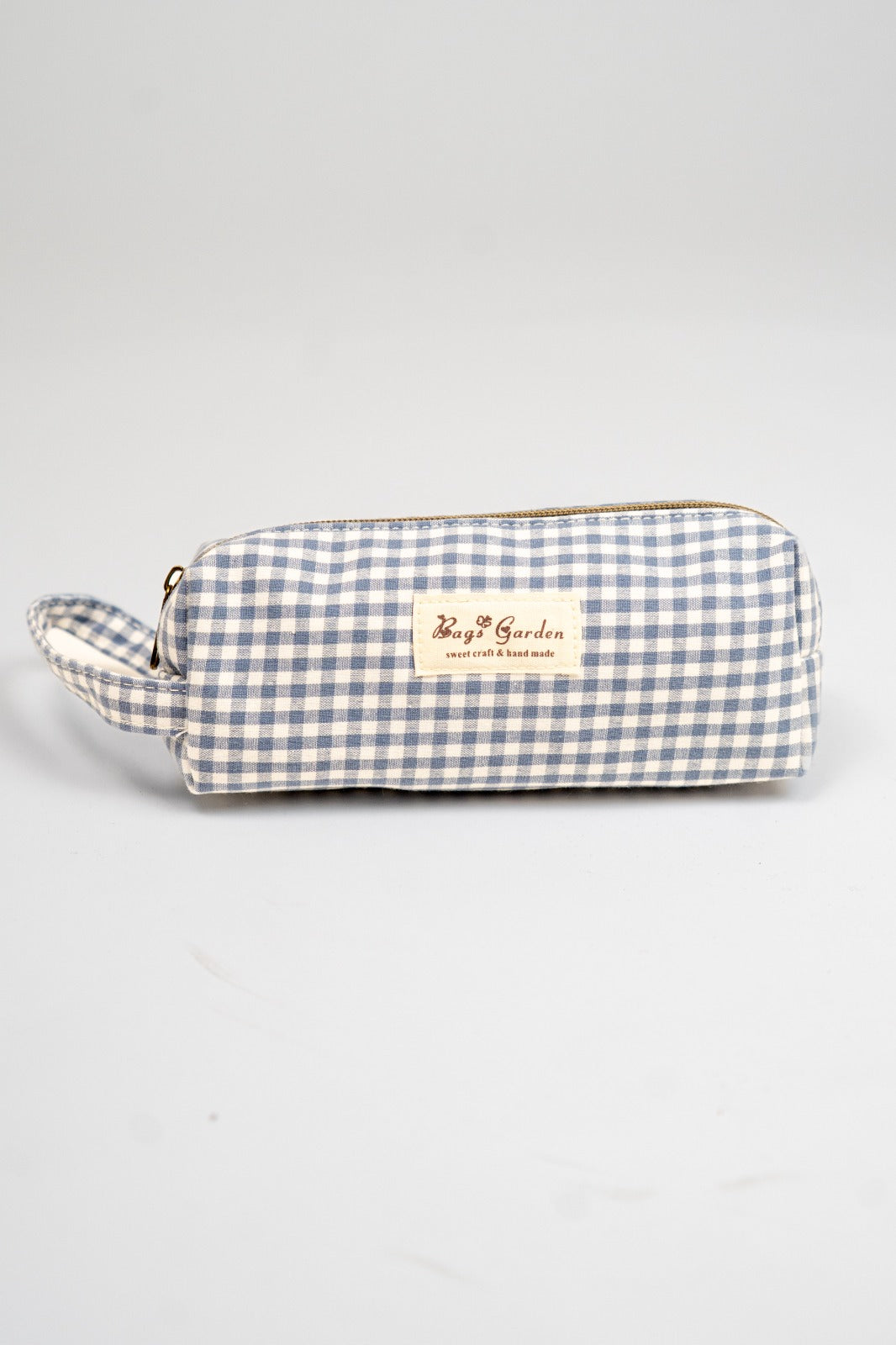 Small pencil case or toiletry bag, zip closure, handle on one side. In white and blue gingham.