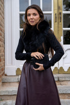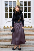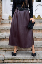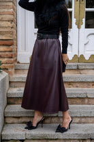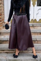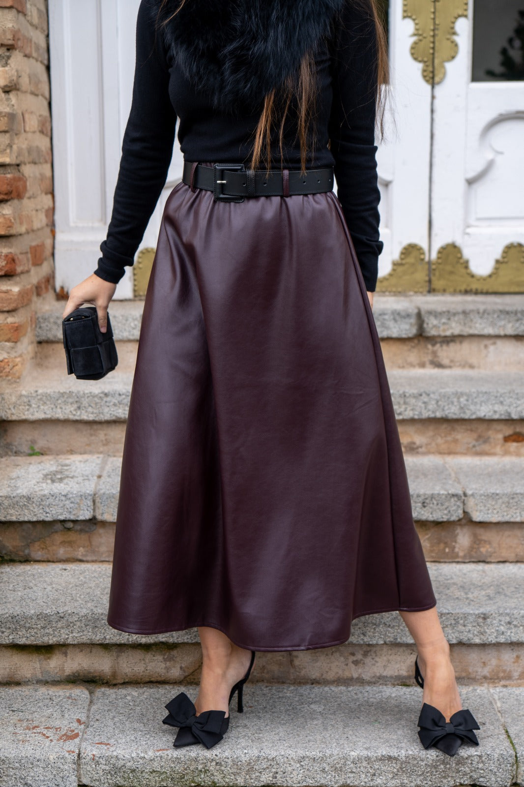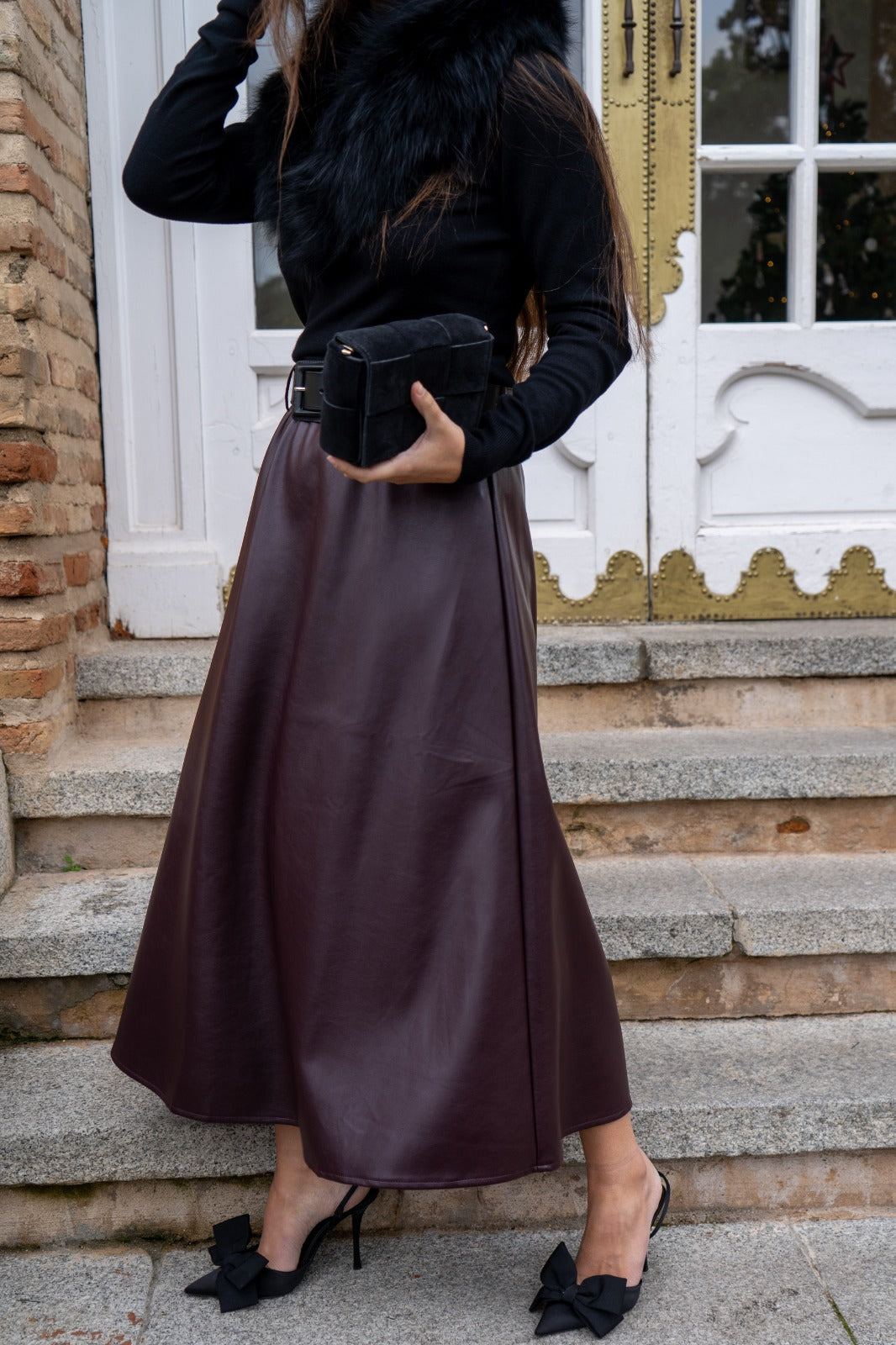 Skirt in poly leather, rubberized waist, flared cut, in burgundy color.