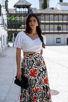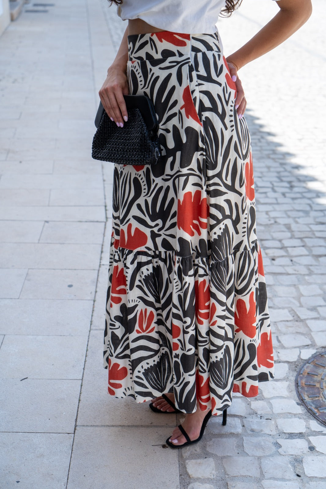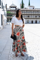 Long skirt, high waist, elasticated back, ruffle at the bottom. In printed colors.