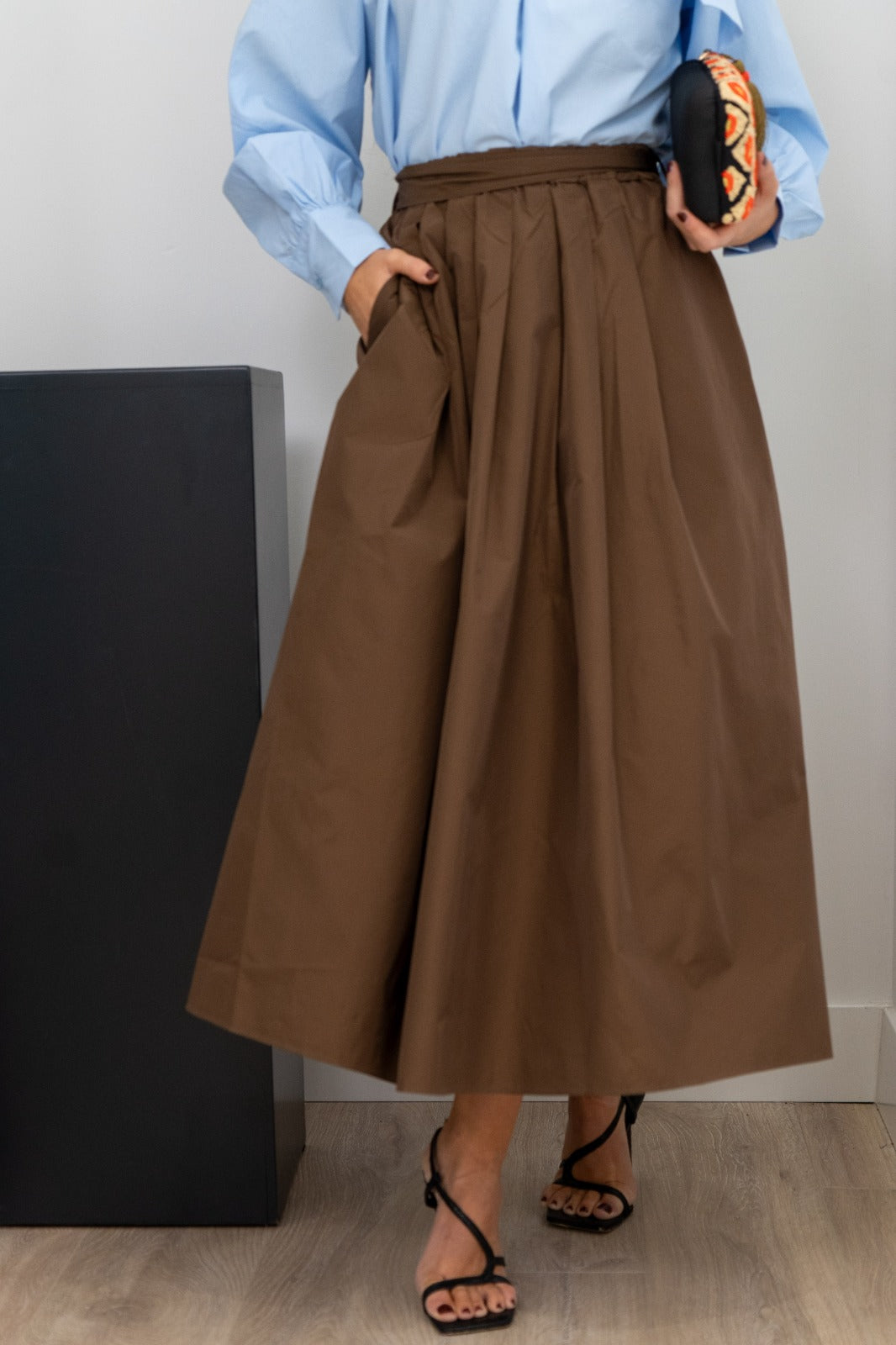 Falda midi, cintura engomada, pinzas delanteras, bolsillos laterales. En tafetán marrón.