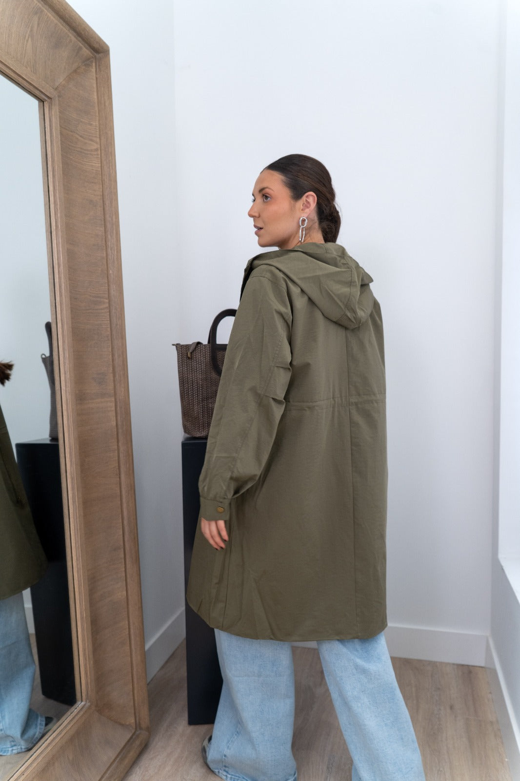 Gabardina con cremallera, capucha, bolsillos laterales, forrada. En color verde.