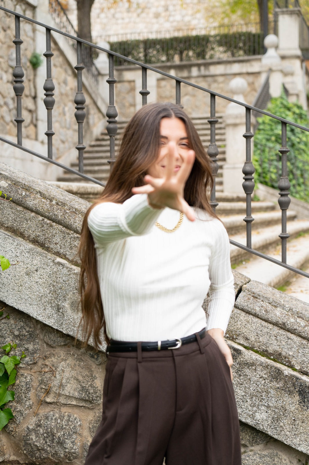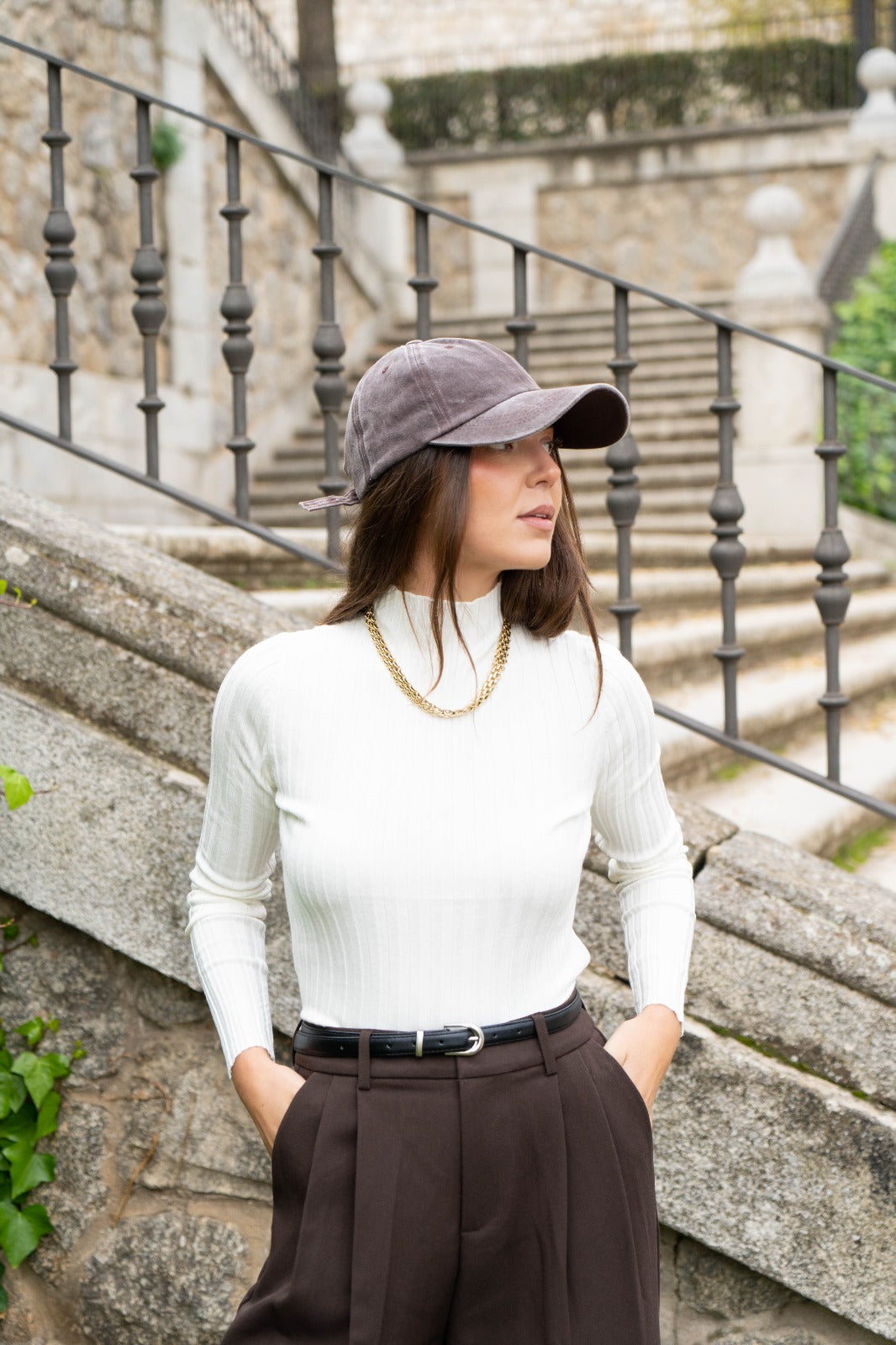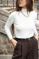 High-neck, long-sleeved sweater in a soft, stretchy fabric. Beige.