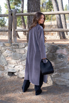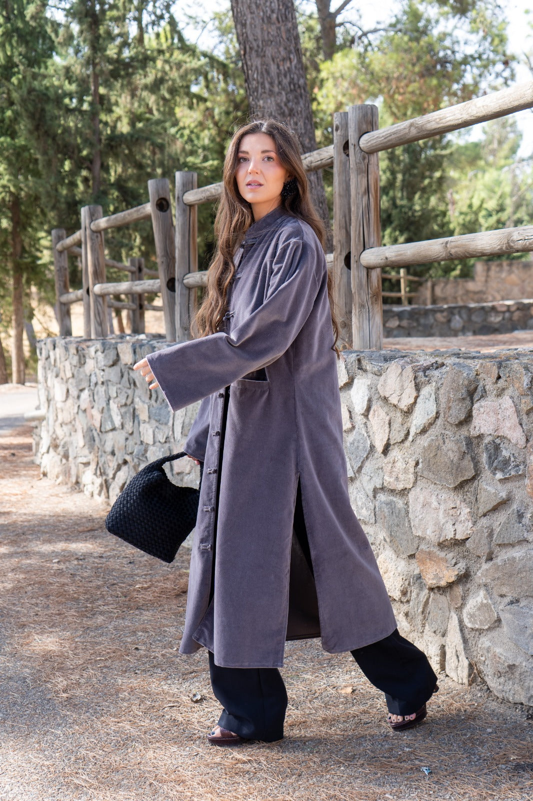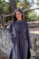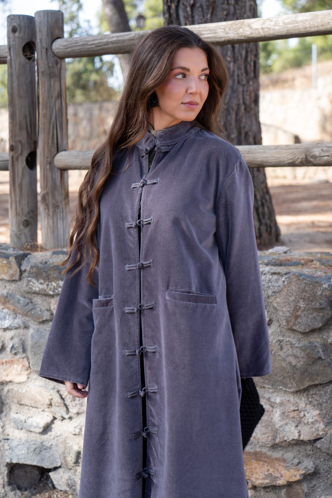 Straight kaftan, side slits, long sleeves, front pockets. In gray velvet.