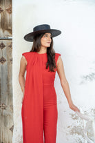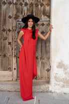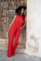 Round-neck jumpsuit with an open back and sleeveless design, draped to one side. In red.