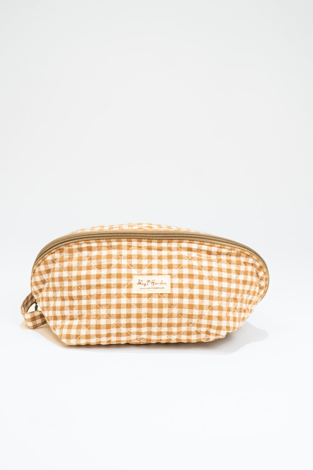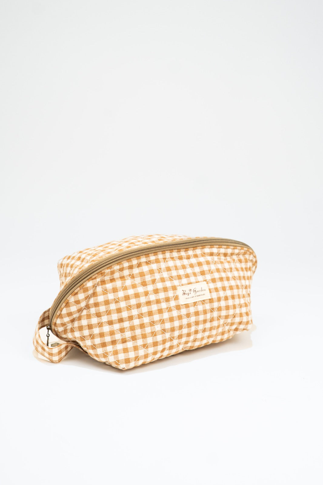 Toiletry bag with zip closure, handle on one side, interior pockets, in white and brown gingham.
